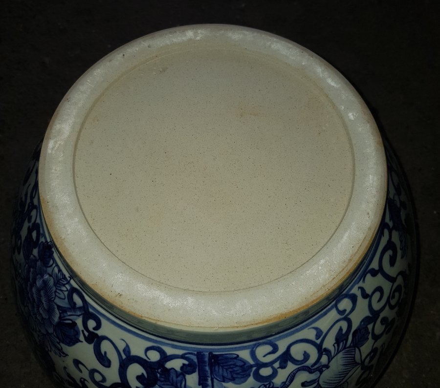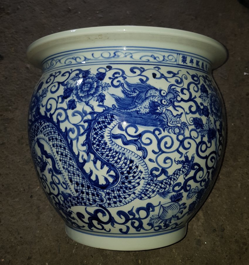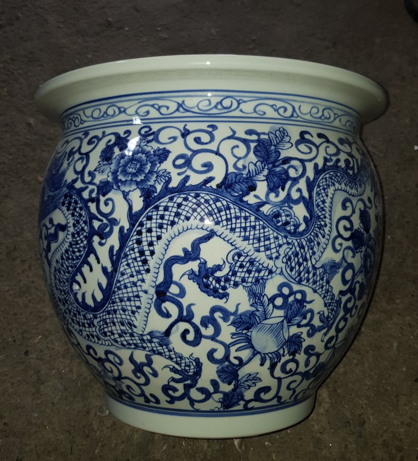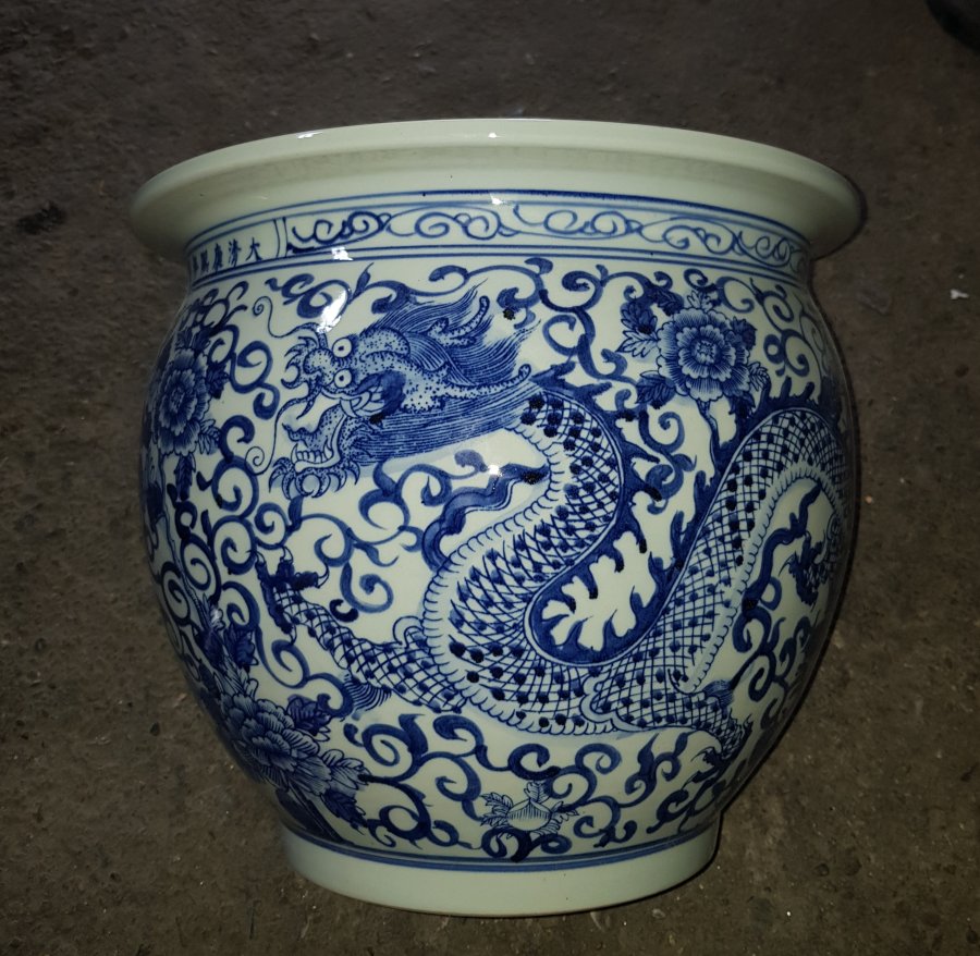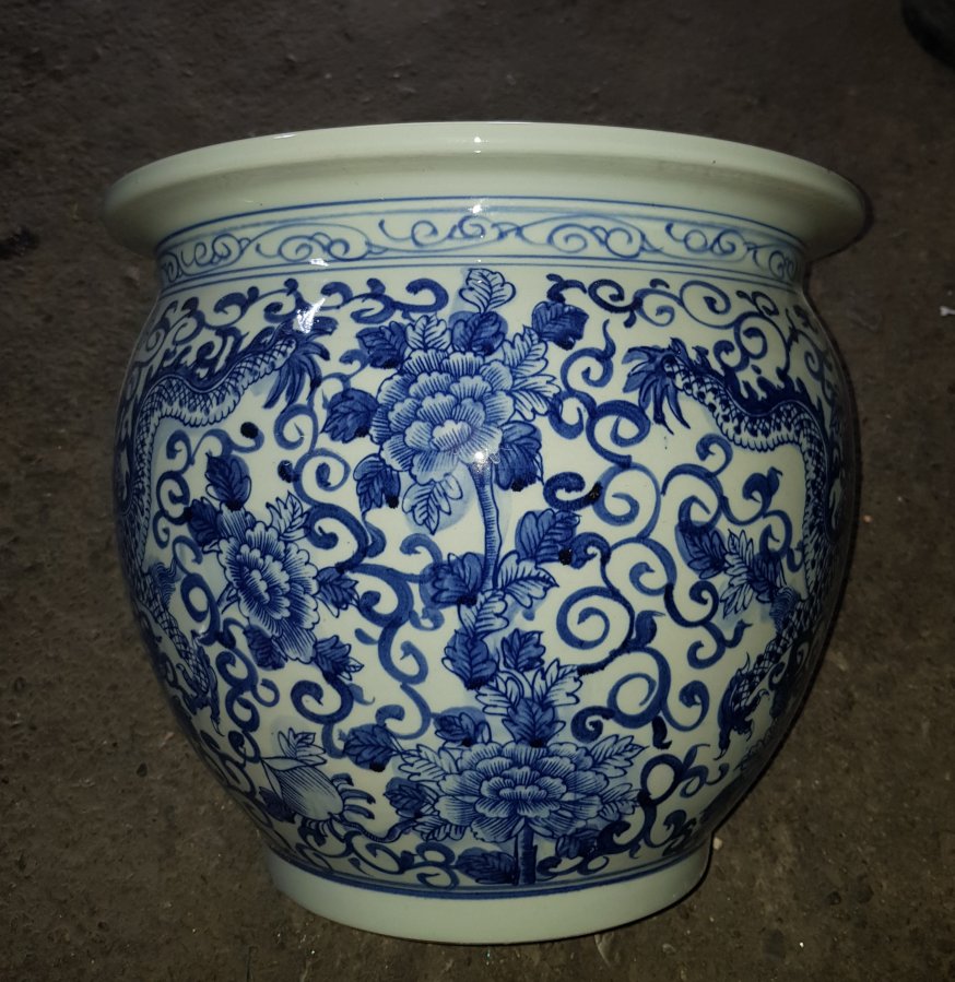 Thống sứ men lam lưỡng Long tiến lộc rất già đồ , dầy nặng tiếng kêu đanh như chuông. Thống cao tổng thể 31.5cm.miệng 36.5cm. lọt lòng 29.5cm. vòng bụng 115cm. lành lặn. GL4550k