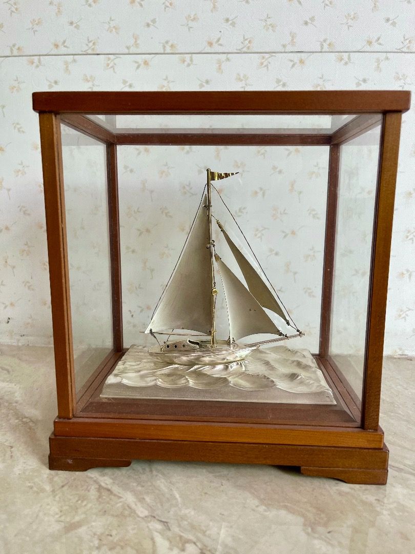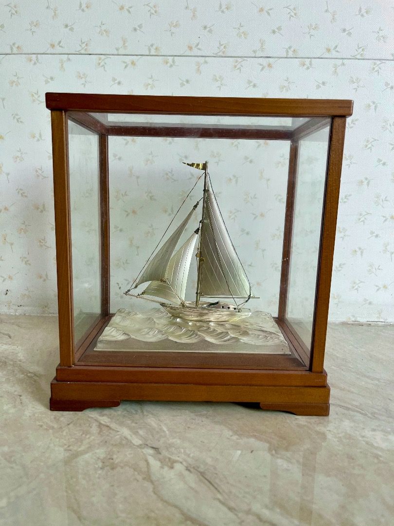 Thuyền bạc khối xưa nhật Khung kính và gỗ . Cao 22 x ngang21cm Thuận buồm xuôi gió giá rất hợp lí