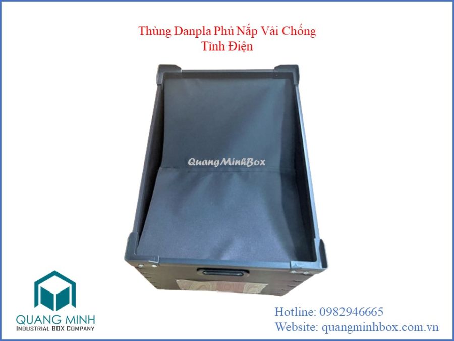Thùng Danpla ESD có nắp vải thiết kế theo kích thước, hình dạng mà khách hàng yêu cầu, in logo, tên công ty, các ký hiệu một cách rõ nét và nổi bật nhất, giúp cho doanh nghiệp có thể bảo quản đựng hàng hóa tốt hơn, chống lại những ảnh hưởng của thời tiết, khí hậu , nấm mốc, chống bụi bẩn.