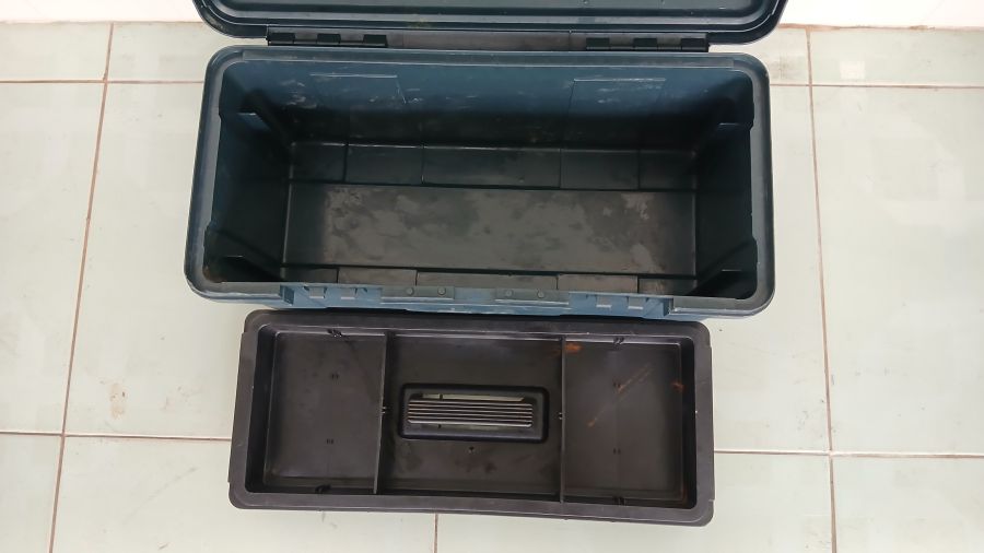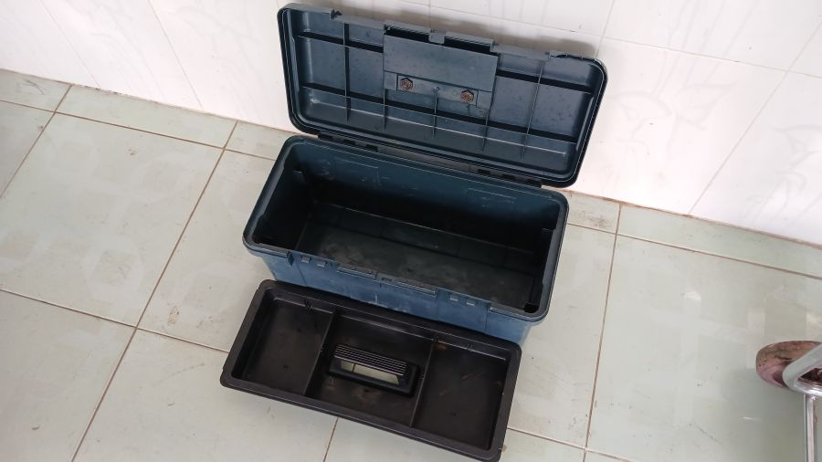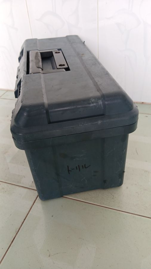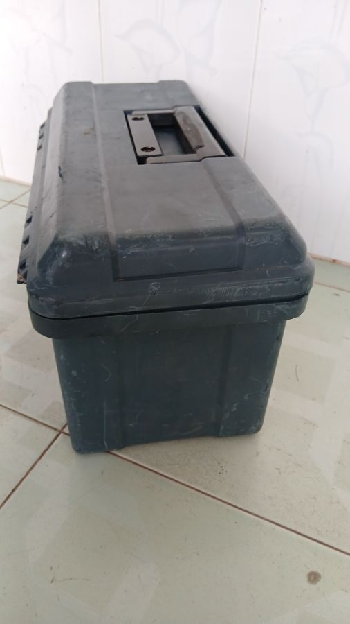 Thùng liền khá đẹp có ngăn phụ do mất 2 khóa gài bán rẻ, loại bằng nhựa anh em để cố định theo ghe tàu thường đi vùng nước mặm bảo quản dụng cụ đồ nghề rất tốt. KT: dài 49cm, rộng 23cm, cao 25cm.