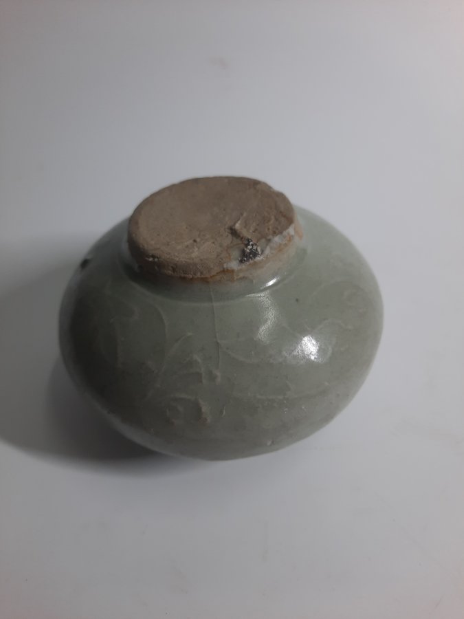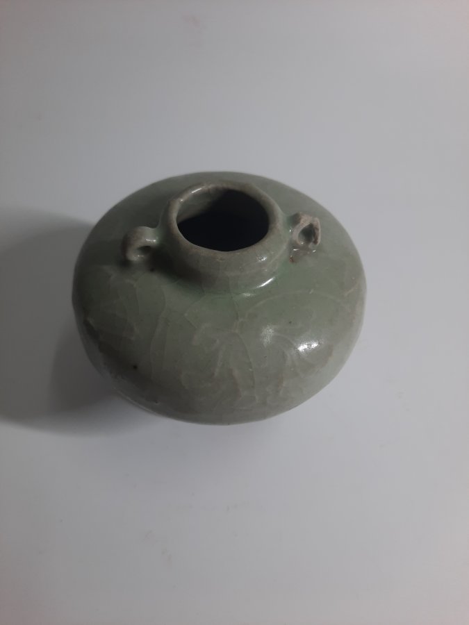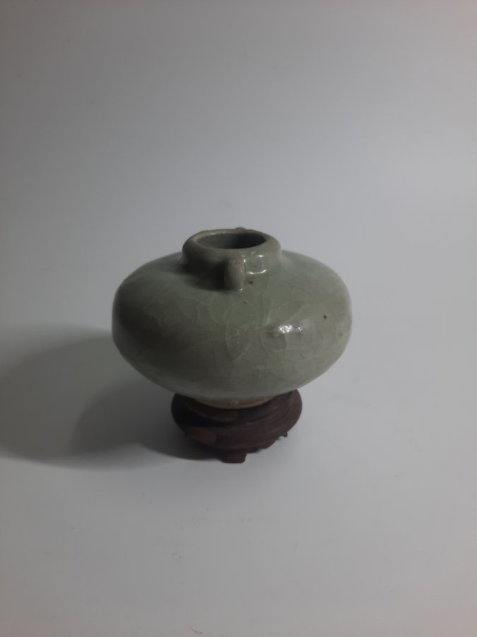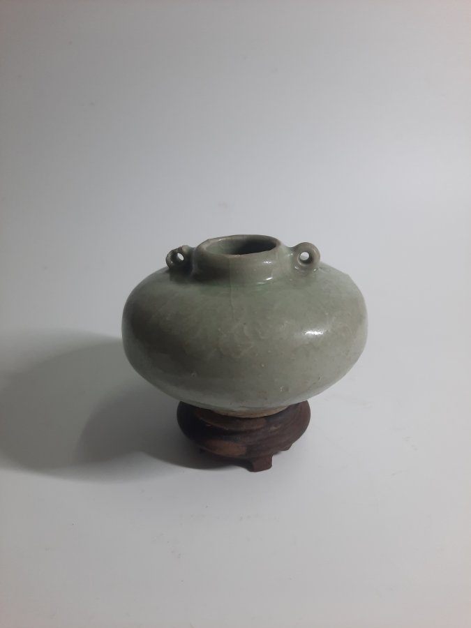 Thủy trì men ngọc ám họa loại to, dáng bánh dày hai quai độc đáo