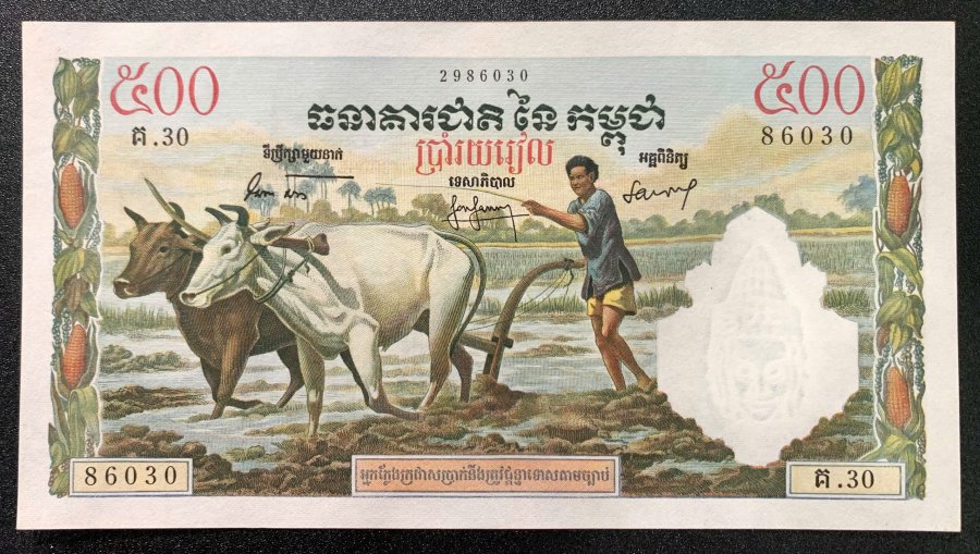 🌻🌻 Cambodia 500 Riels 1968 AU UNC P14c