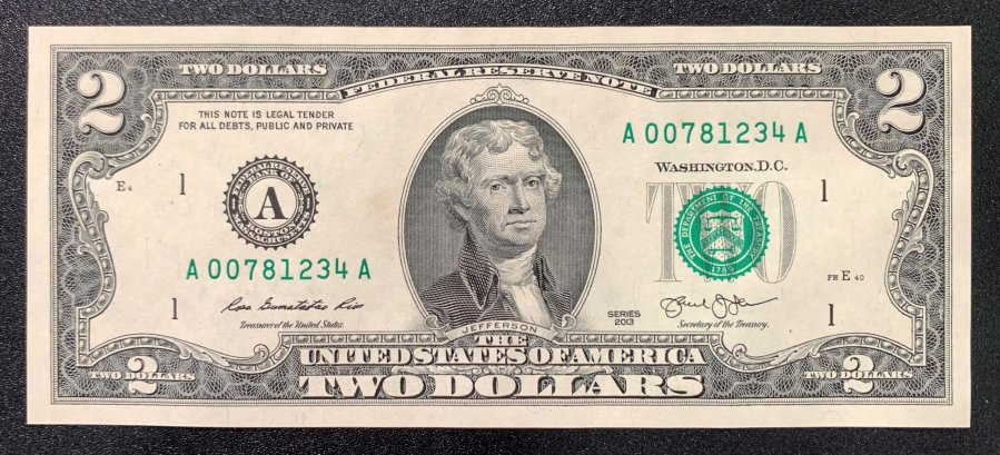 🍋 Mặt trước: Chân dung Thomas Jefferson ở trung tâm với dấu mộc đỏ và số seri đỏ đặc trưng của dòng tiền "United States Note".