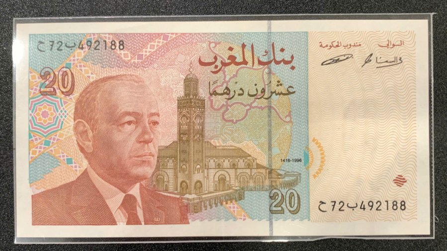 🍋 Mặt trước: Chân dung Vua Hassan II (người trị vì Morocco từ 1961-1999) ở bên phải và hình ảnh Thánh đường Hassan II tại Casablanca – một trong những thánh đường lớn nhất thế giới – ở phía sau.