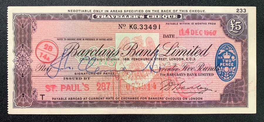 🍑🍑 UK Traveller\'s Cheque 5 Pound 1960 Barclays Bank AUNC