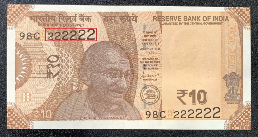 🍋 Mặt trước: Chân dung Mahatma Gandhi ở chính giữa, biểu tượng quốc huy Ấn Độ (hình đầu sư tử Ashoka) ở góc dưới bên phải và các ký tự bảo mật hiện đại.