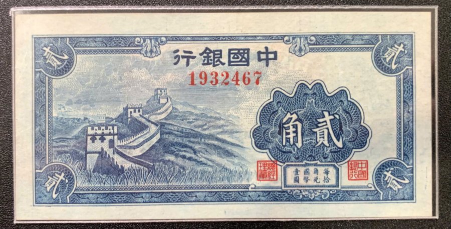 🍋 Mặt trước: Hình ảnh Vạn Lý Trường Thành hùng vĩ trải dài bên trái, dòng chữ tên ngân hàng "行銀國中" (Ngân hàng Trung Quốc) ở trên cùng và mệnh giá "角貳" (2 Jiao/20 Cents) nằm trong khung hoa văn lớn bên phải.