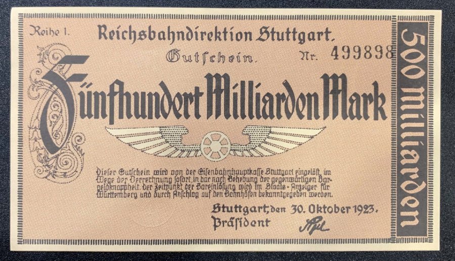 🍋 Tờ tiền này được phát hành bởi Tổng cục Đường sắt Đế chế (Reichsbahndirektion) tại Stuttgart như một loại tiền khẩn cấp (Notgeld) trong thời kỳ siêu lạm phát đỉnh điểm, khi các cơ quan chính phủ phải tự in tiền để duy trì hoạt động và trả lương cho công nhân.