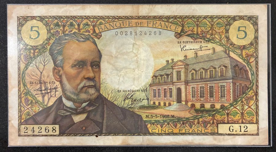 🍋Mặt sau: Hình ảnh Louis Pasteur đang làm việc với kính hiển vi, bên cạnh là các biểu tượng nhành nho và động vật tượng trưng cho các nghiên cứu về lên men và vaccine.