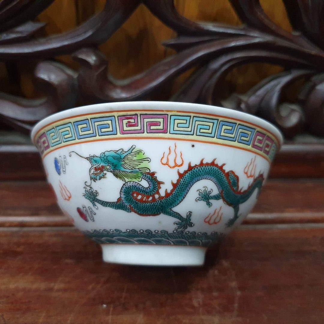 Tô Tàu xưa vẽ hai Rồng xanh 5 móng chầu Mặt trời - Song Long chầu Nhật .