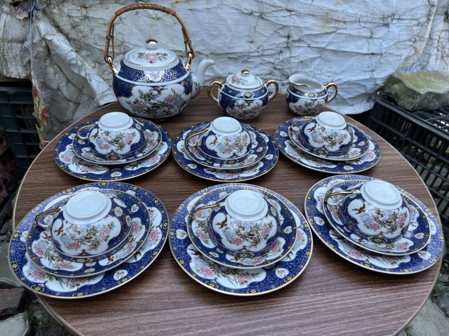 🍵1 ấm lớn( có lõi lọc trà),1 ấm đường, 1 ấm sữa, 6 đĩa bánh, 6 đĩa lót, 6 tách triện Geisha👱♀️sứ xương đúc chìm thấu quang.