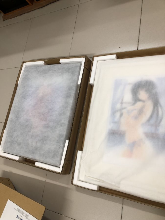 E về được 2 bức tranh anime Nhật, chưa sd còn giấy tờ , Tấm bằng khung kim loại 7tr , còn tấm khung Sơn mài trắng thì 6tr ạ !