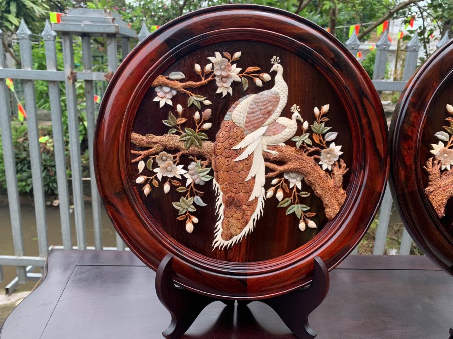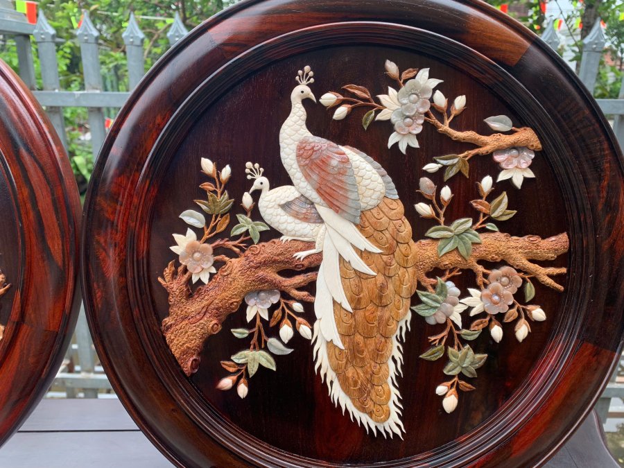 Tranh đĩa phu thê gỗ trắc khảm nổi gỗ xưa đá nga Kt 38