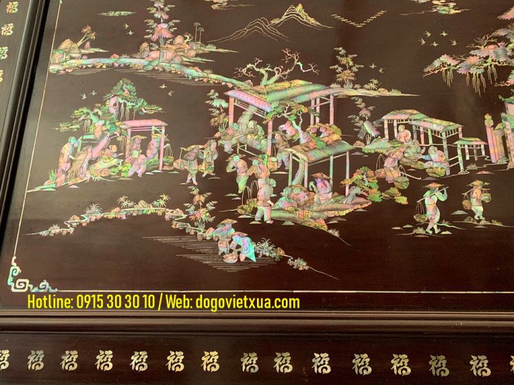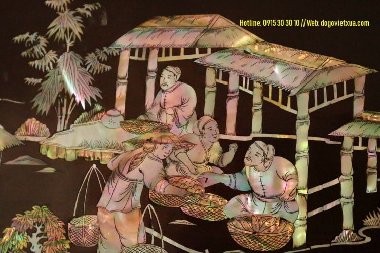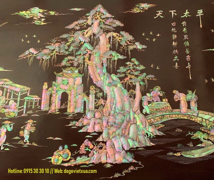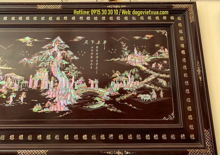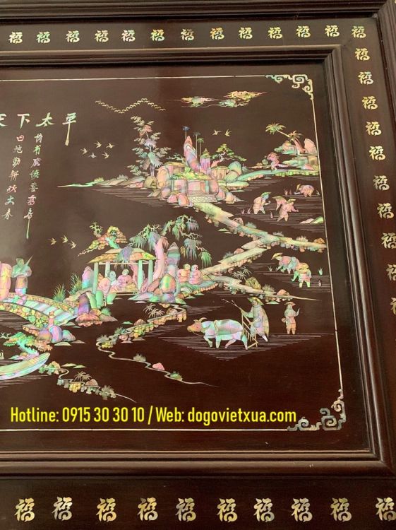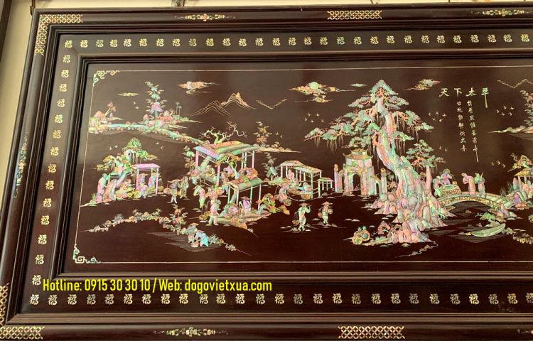 Hôm nay Đồ Gỗ Việt Xưa sẽ giới thiệu đến quý khách gần xa một bức tranh khảm ốc đẹp, khảm cảnh Thiên Hạ Thái Bình (cảnh chợ quê, đồng quê, làng quê việt nam với cổng làng, cây đa giếng nước sân đình, hình ảnh con trâu người nông dân cấy cầy, hình ảnh người thương nhân buôn bán tấp lập...).