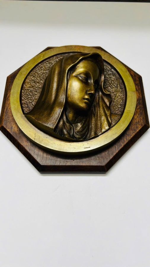Tranh Đức mẹ bằng đồng đúc cuối thế kỷ 19 - tác giả Pollet ( Pháp ) - Có triện - Được đúc bằng đồng cực dày và sắc nét Kích thước: C 27 cm , dày 9,5 cm Nặng 2,4 kg