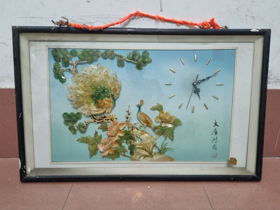 Tranh ghép từ vỏ ốc, trai, s.ừ.ng. Kết hợp đồng hồ. Hàng xưa cũ. Ngang 84 cm, cao 52 cm.💲1,2 tr. ☎ Face + Zalo