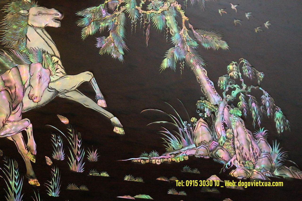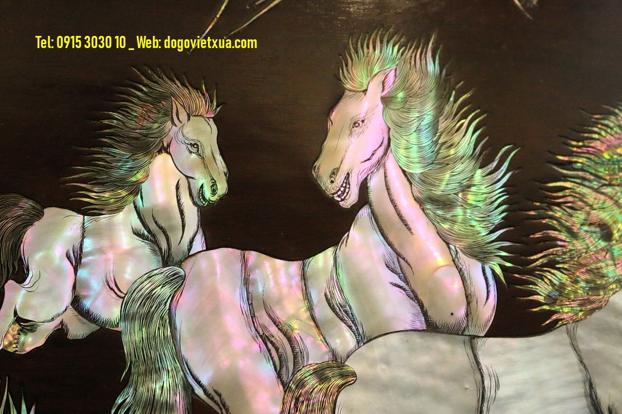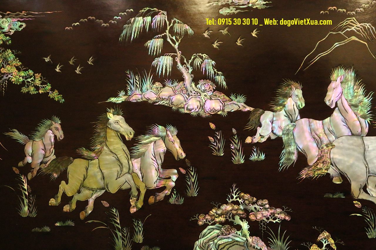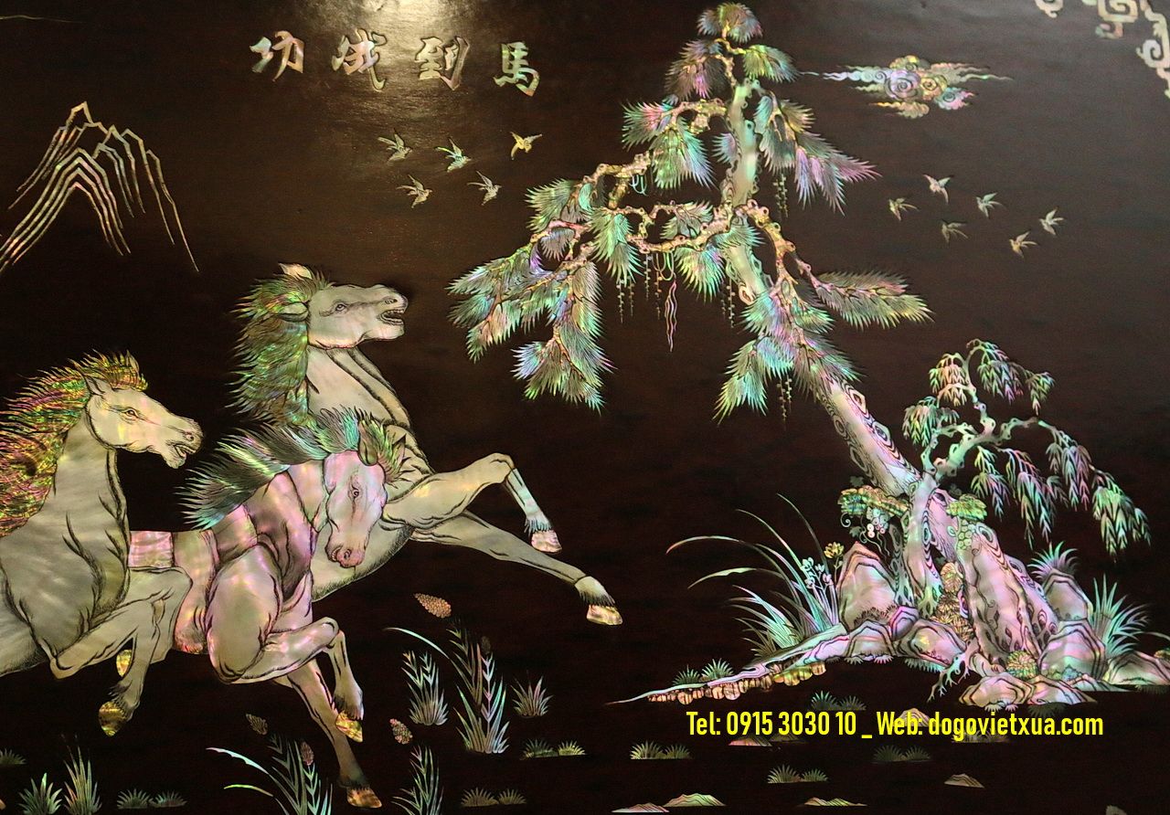 Bức tranh bát mã truy phong ( Tranh Ngựa – Tranh Mã Đáo Thành Công ) gỗ gụ này được khảm ốc đặc biệt kỹ bởi bàn tay nghệ nhân truyền thần 8 chú ngựa (mã) rất giống như thật, có hồn nét khắc họa truyền thần tỉ mỉ tinh tế,…