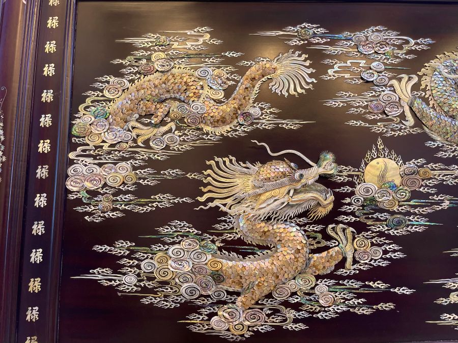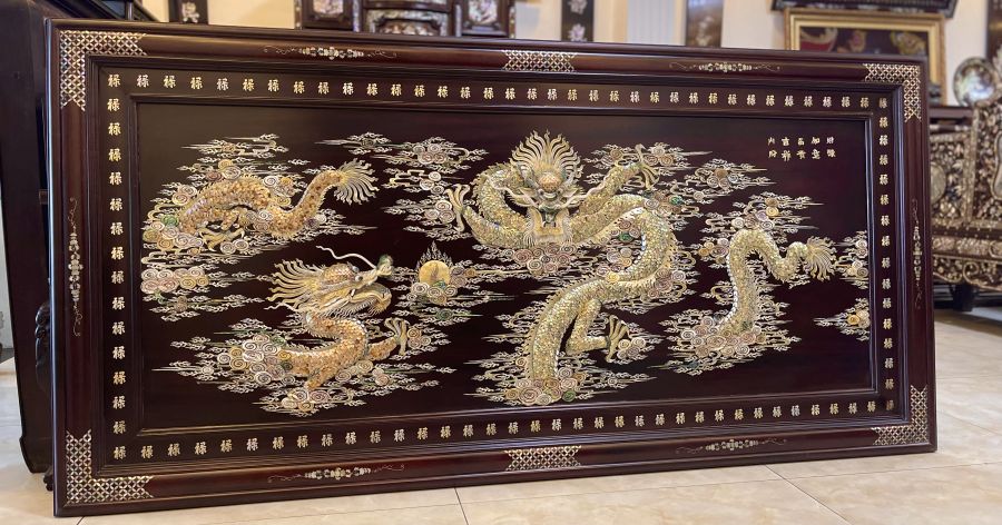 • Kết hợp giữa ốc xà cừ đẹp và nghệ thuật khảm nổi tạo ra một tác phẩm vô cùng tinh sảo Lưỡng Long Tranh Châu.