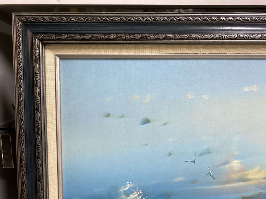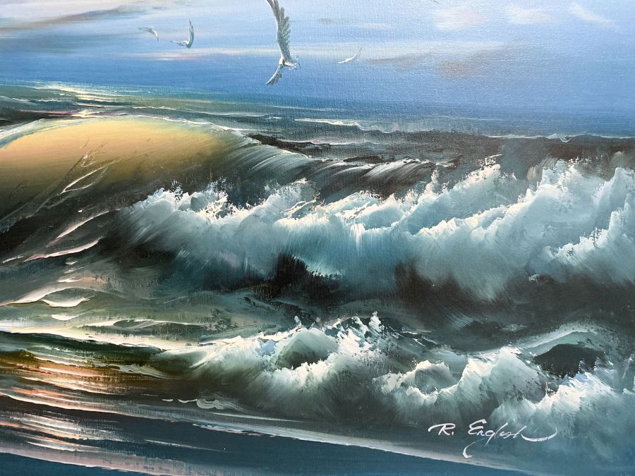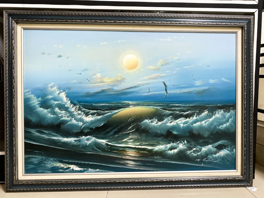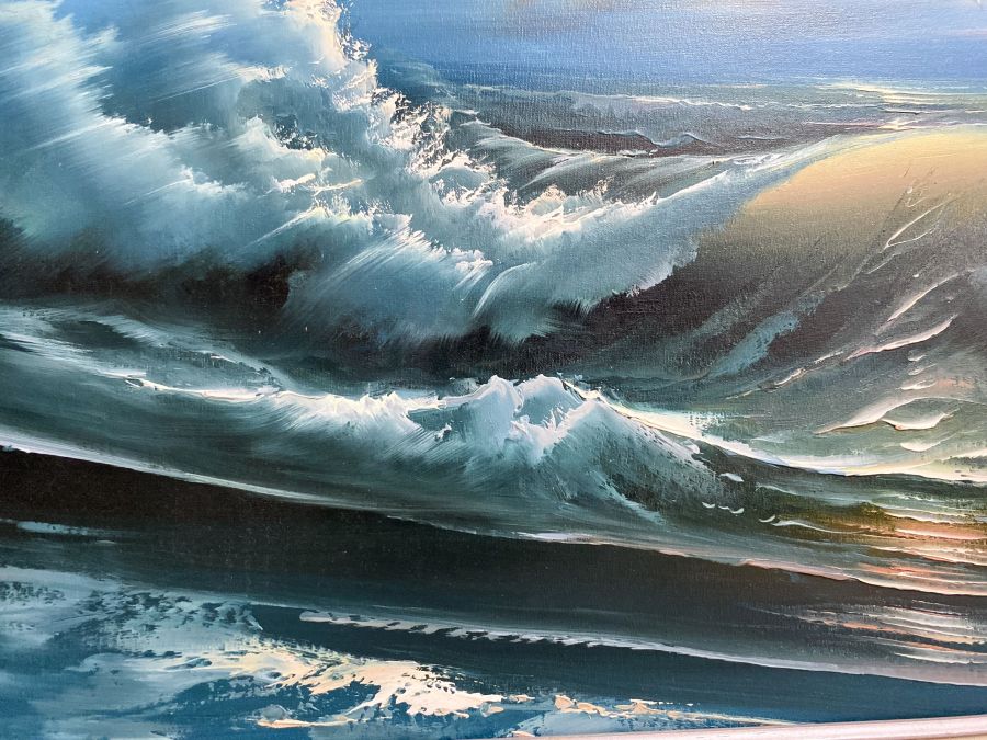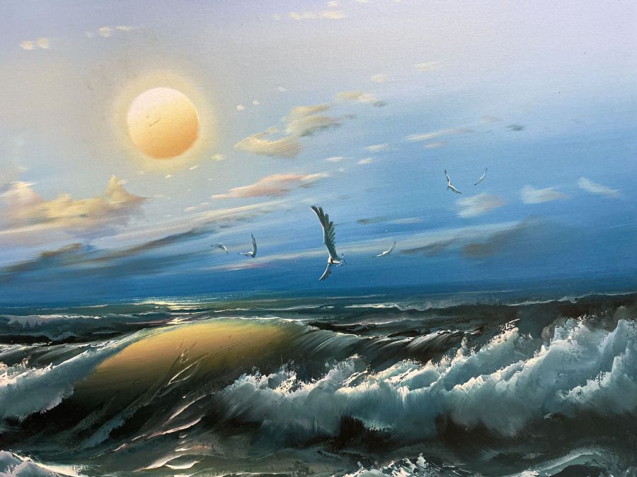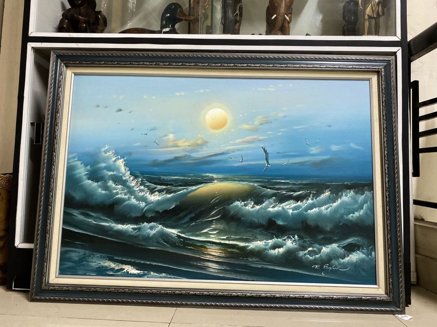 Tranh sơn dầu cảnh bình minh trên bãi biển mạnh mẽ.