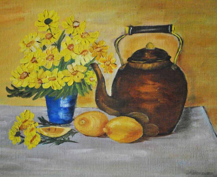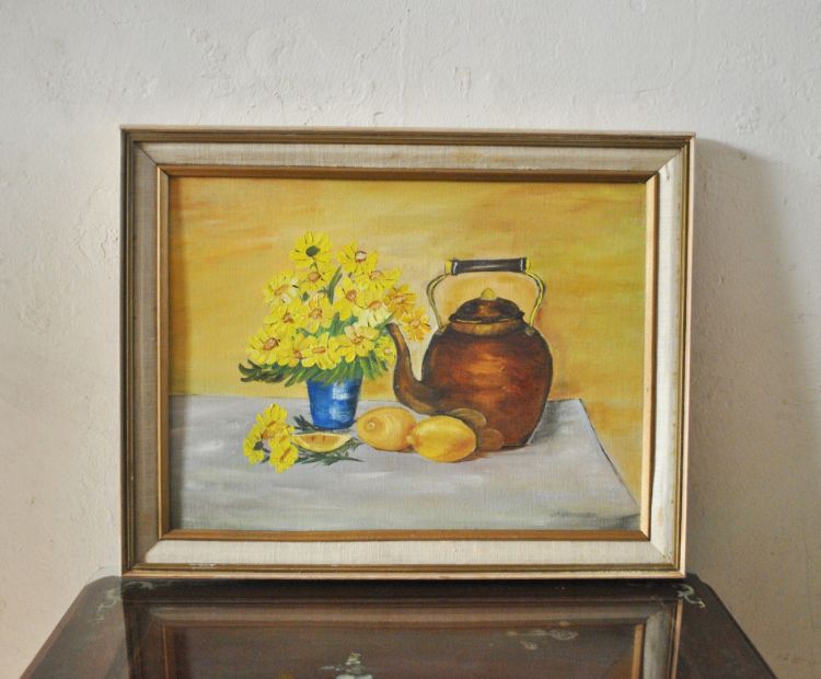 Tác phẩm : Tranh sơn dầu tĩnh vật hình ấm trà và bình hoa