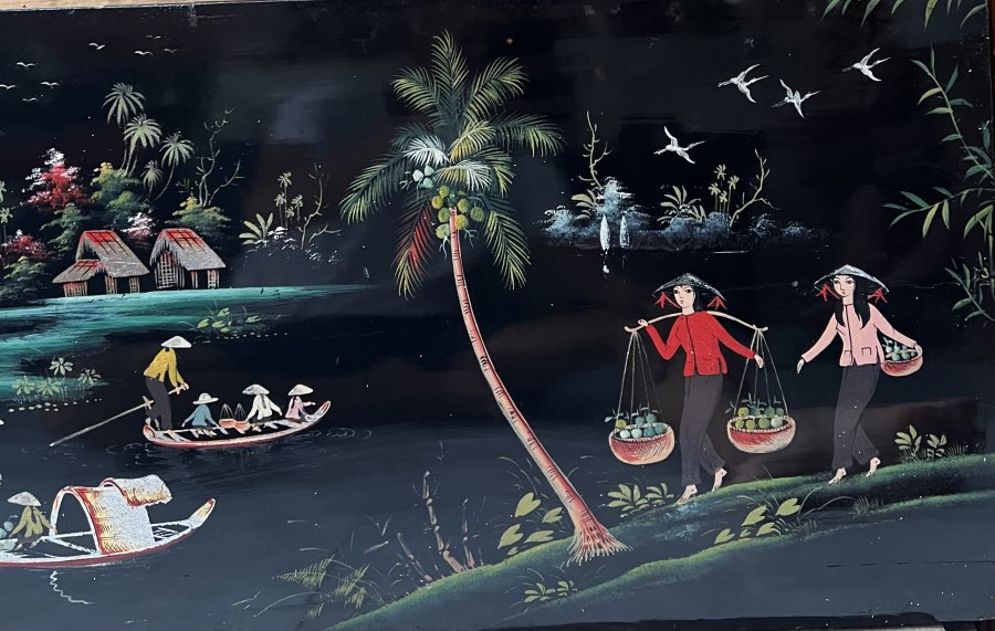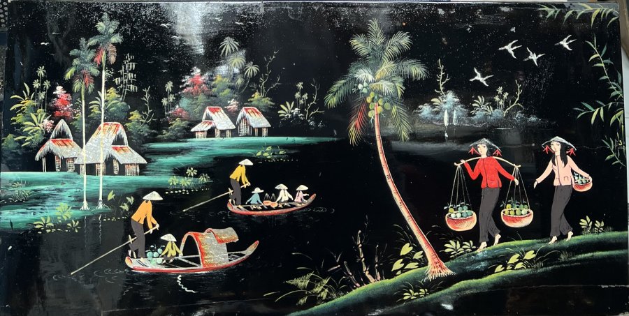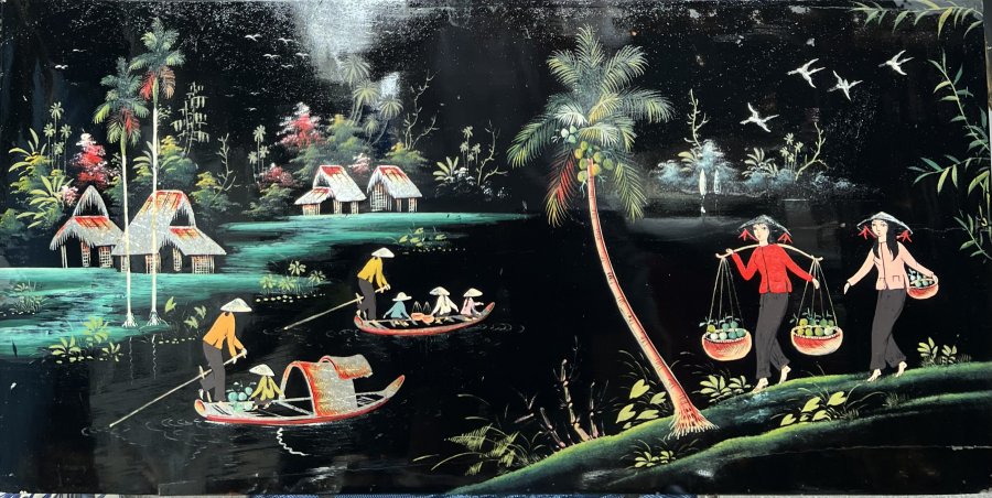 Tranh Sơn mài nhủ bạc gỗ mít xưa Tích Quê Hương Thanh Bình Kt 40cm x 80cm