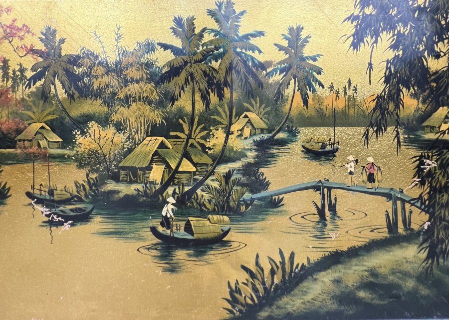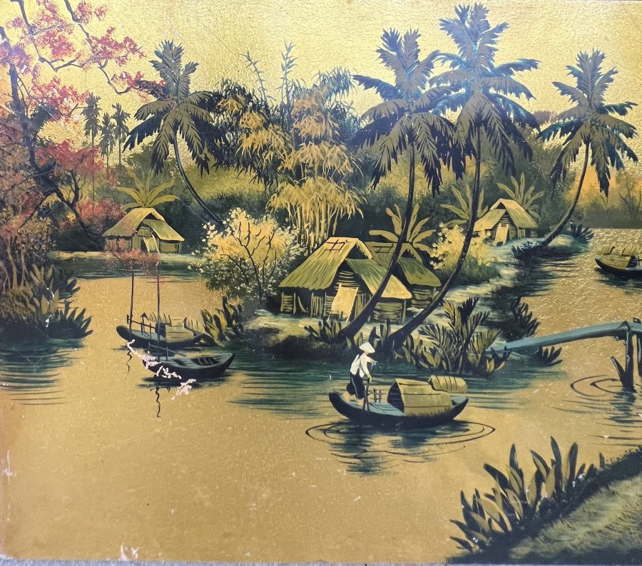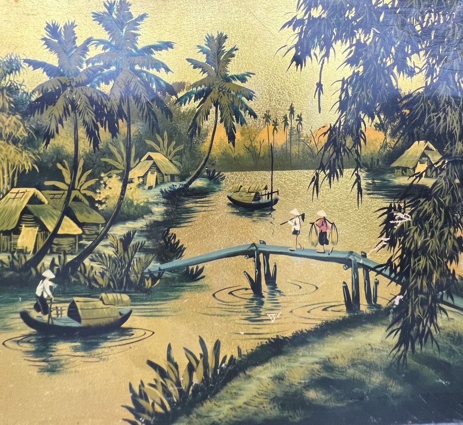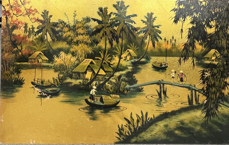 Tranh Sơn mài nhủ vàng xưa Tích Quê Hương Thanh Bình Kt 50cm x 80cm Giá 1200k