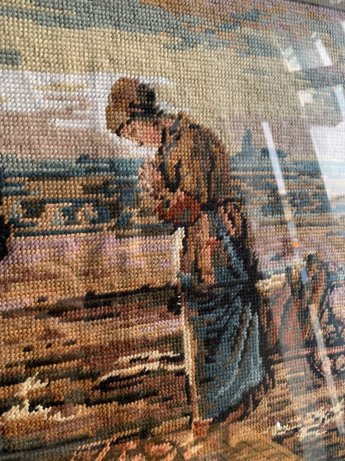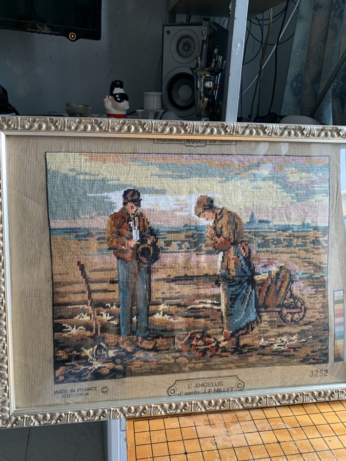 Đây là một bức tranh thêu (needlepoint) treo tường theo tác phẩm hội họa "L'Angélus" của Jean-François Millet