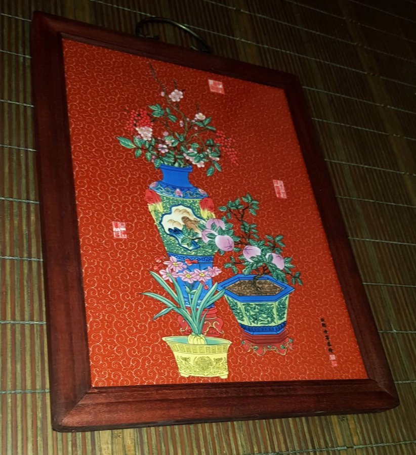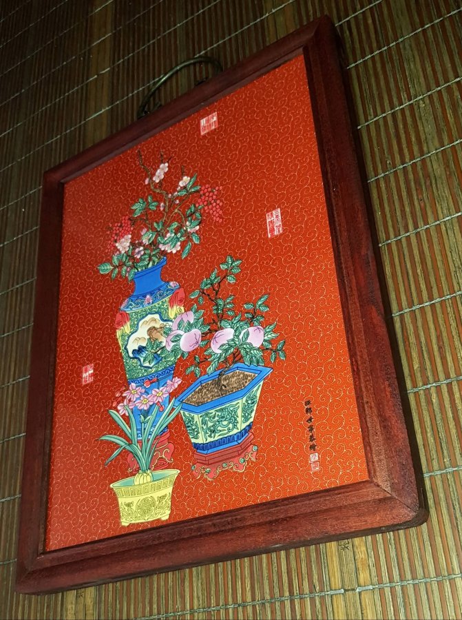 Tranh treo Tết bằng sứ khung bằng gỗ liền lạc , khung liên kết bằng mai mộng. Tranh có họa pháp theo lối cổ đồ trên nền sắc đỏ , sắc mầu của tân niên. Tranh nhỏ kích thước 37cmx28cm. Tranh lành lặn. GL790k