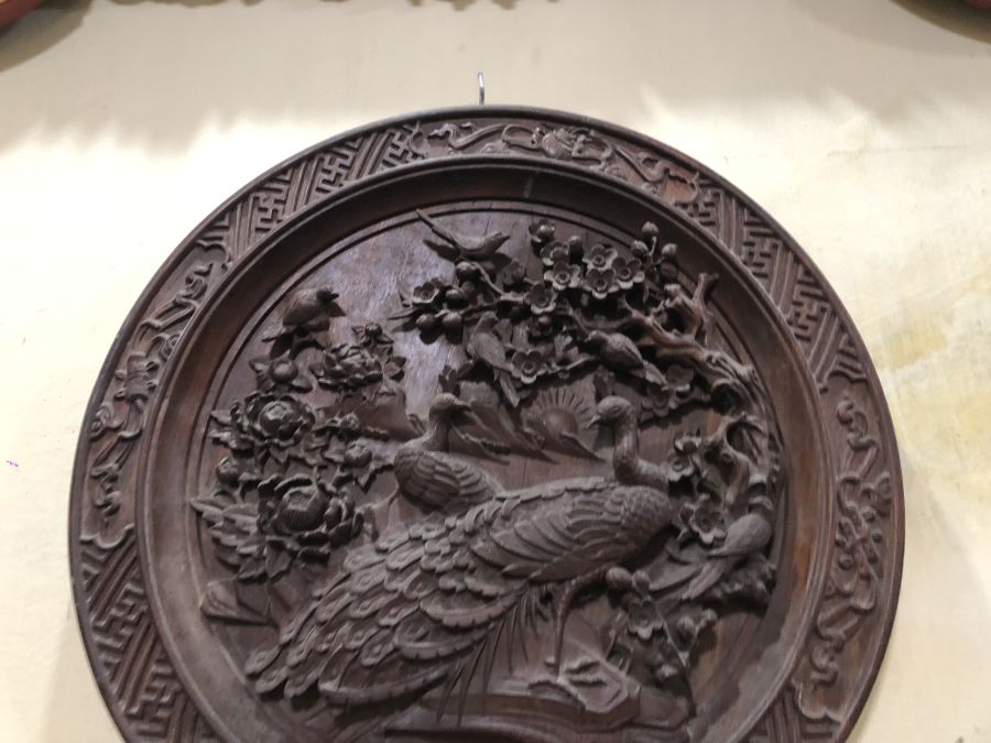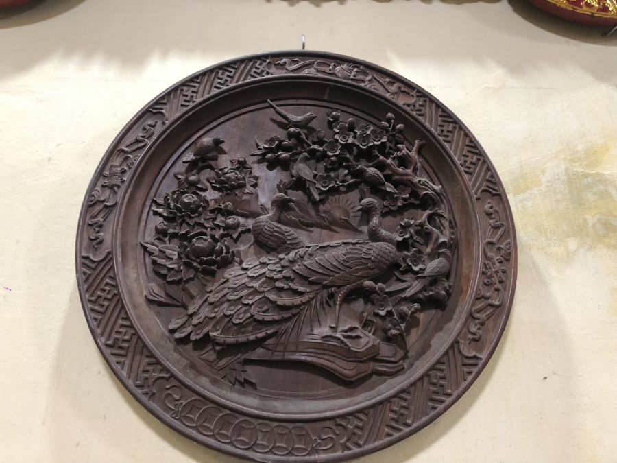 Tranh tròn phu thê viên mãn gỗ gụ dk 50 dày 5cm