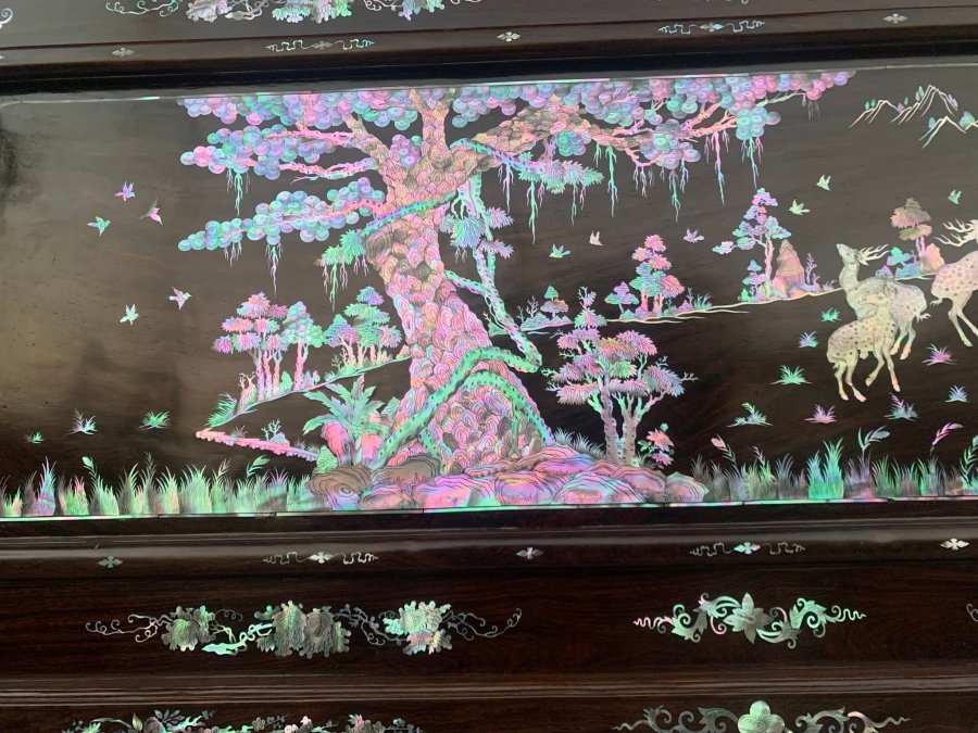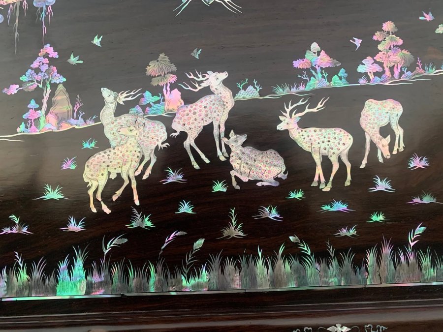 Tranh tùng hươu khảm ốc đỏ Singapore Kt 127/61cm