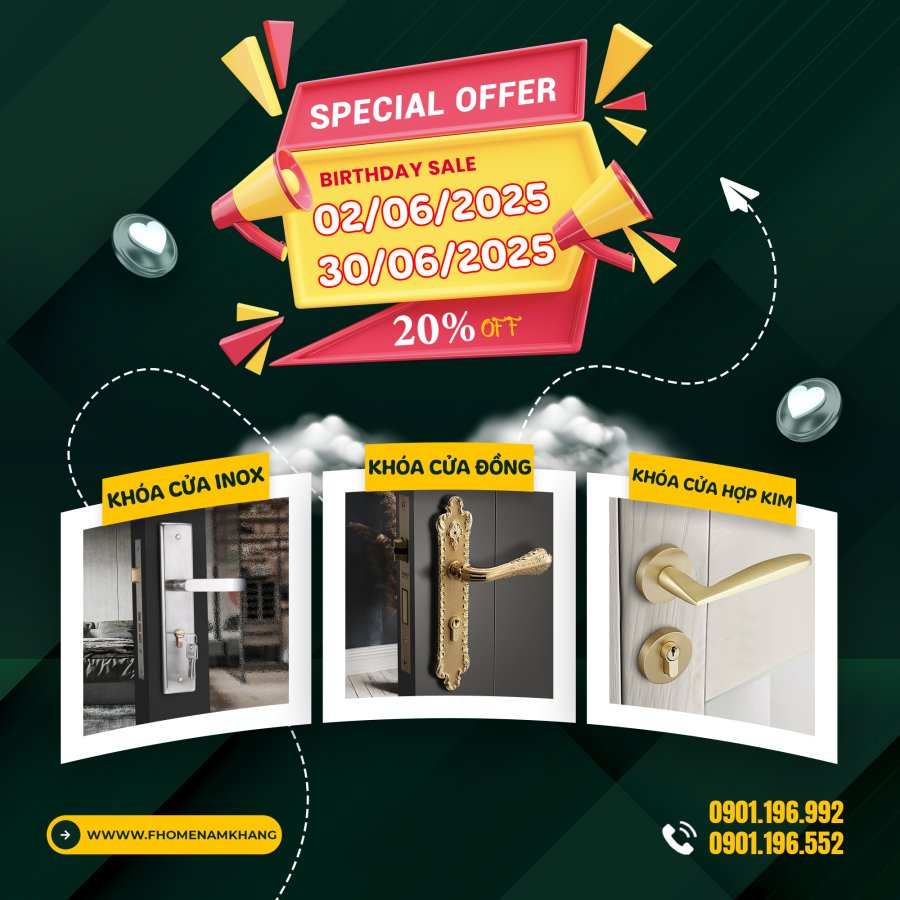 Để gửi lời tri ân đến quý khách hàng, nhân dịp chào mừng tháng thành lập công ty Nam Khang xin gửi đến quý khách hàng chương trình ưu đãi 20% cho toàn bộ sản phẩm khi quý khách có phát sinh giao dịch từ 02/06 đến hết ngày 30/06/2025. Cảm ơn quý khách đã đồng hành cùng FhomeNamKhang trên chặng đường phát triển.