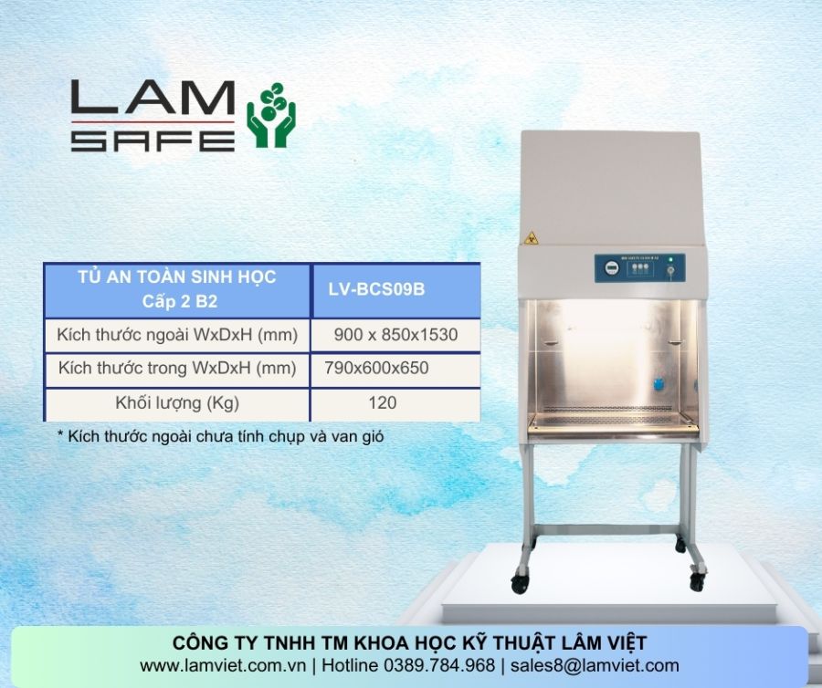 - Tủ an toàn sinh học cấp II loại B2, thương hiệu LAMSAFE, tuân thủ tiêu chuẩn NSF/ANSI 49.