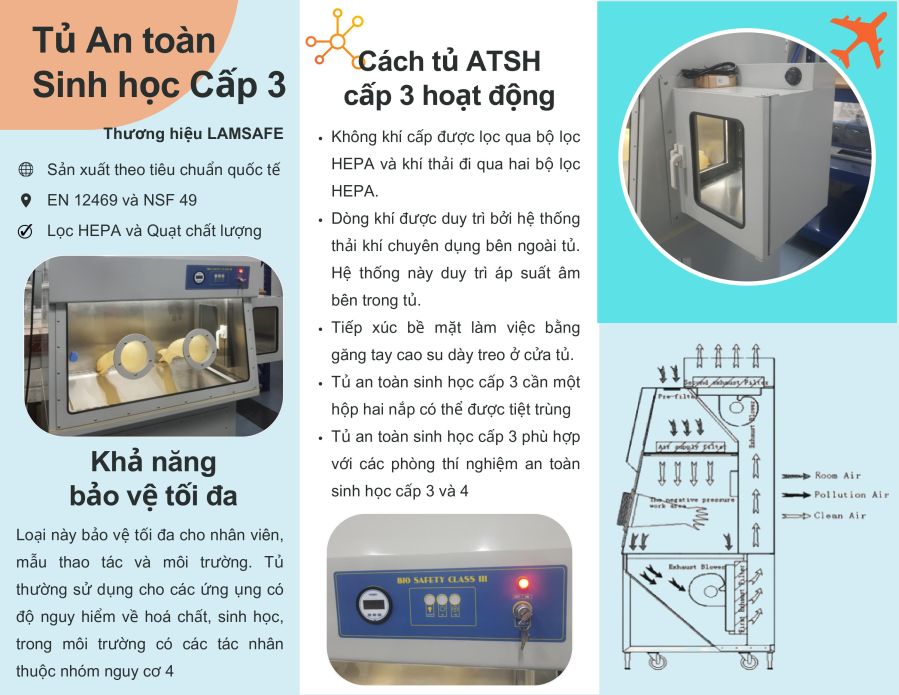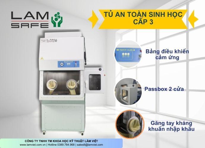 - Tủ an toàn sinh học Class III của thương hiệu LAMSAFE được sản xuất theo tiêu chuẩn EN 12469 và NSF 49. Với thiết kế nghiêng 10 độ ở phần trước, tủ mang lại sự thoải mái cho người vận hành khi thao tác.