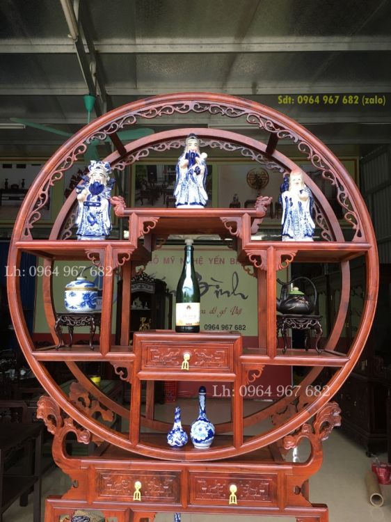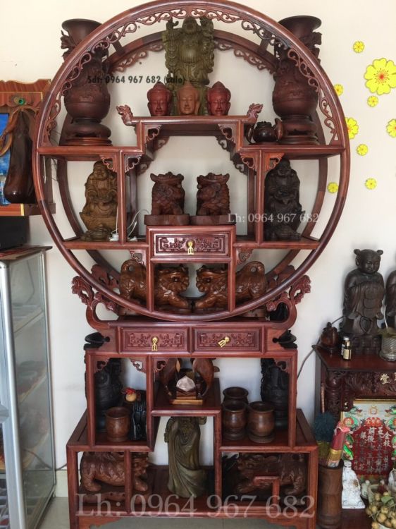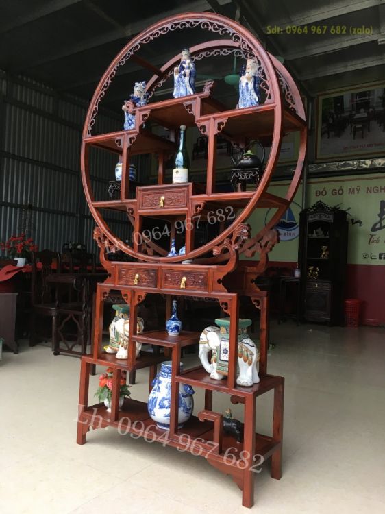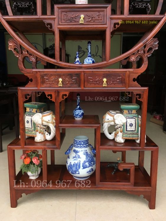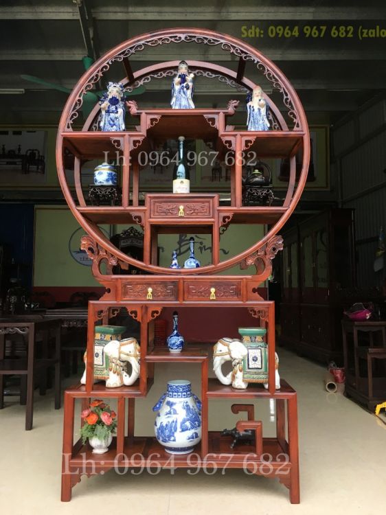 Tủ bình phong gỗ hương bày đồ tứ diện được thiết kế trên cùng là kệ được thiết kế theo lối hình tròn bao quanh tạo ra một kiểu dáng sang trọng, mới lạ. p bên dưới là hình chữ nhật.