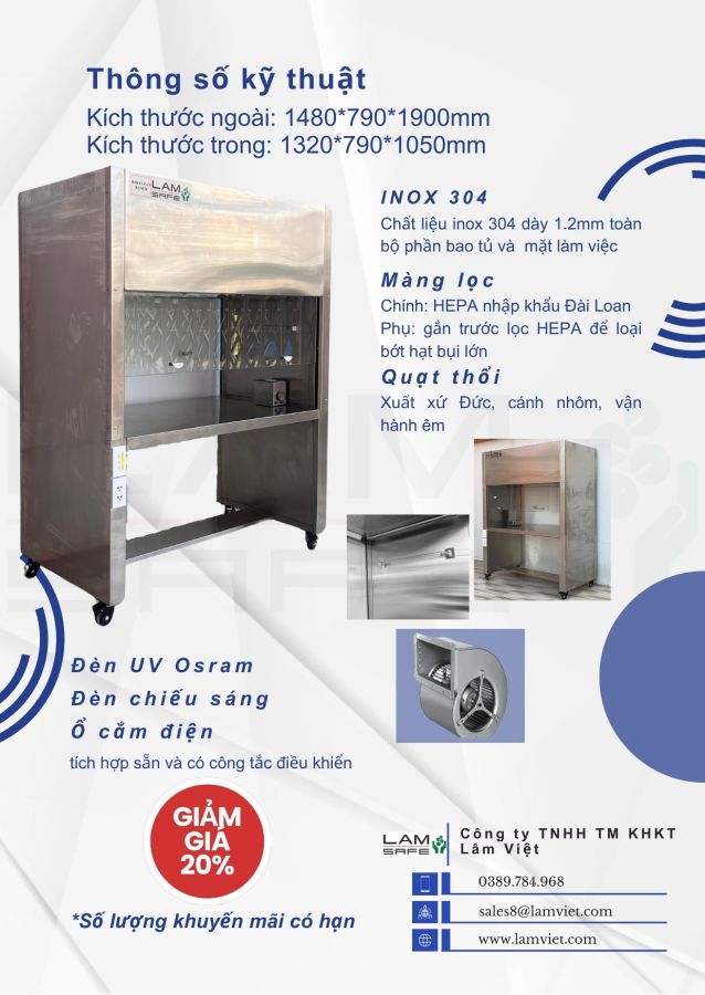 - Tiện ích gia tăng: Đi kèm đèn UV tiệt trùng và chiếu sáng bằng đèn huỳnh quang, hỗ trợ các hoạt động thí nghiệm trong điều kiện ánh sáng tối ưu.