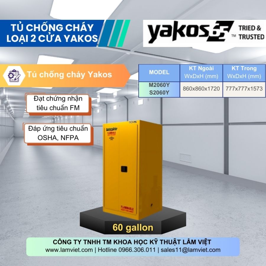 - Tủ đựng dung môi gây ăn mòn Yakos65 loại 02 cửa của hãng sản xuất Chung Fu từ Đài Loan, với thương hiệu Yakos65 thuộc series SafetyStar, được chứng nhận chất lượng FM và tuân thủ các tiêu chuẩn OSHA, NFPA. Sản phẩm này được sản xuất theo tiêu chuẩn ISO 9001-2008 và sơn màu xanh tiêu chuẩn để chứa dung môi có tính ăn mòn, đảm bảo an toàn tuyệt đối cho người lao động và môi trường làm việc.