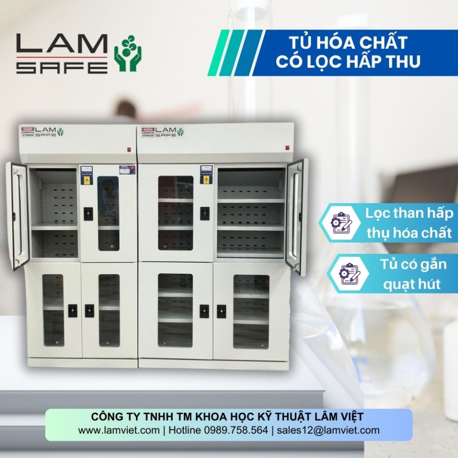 - Tủ chứa hóa chất có lọc than hoạt tính giúp hấp thu một phần lượng khí thoát ra trong quá trình lưu trữ.