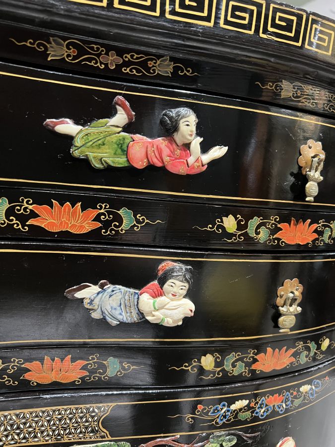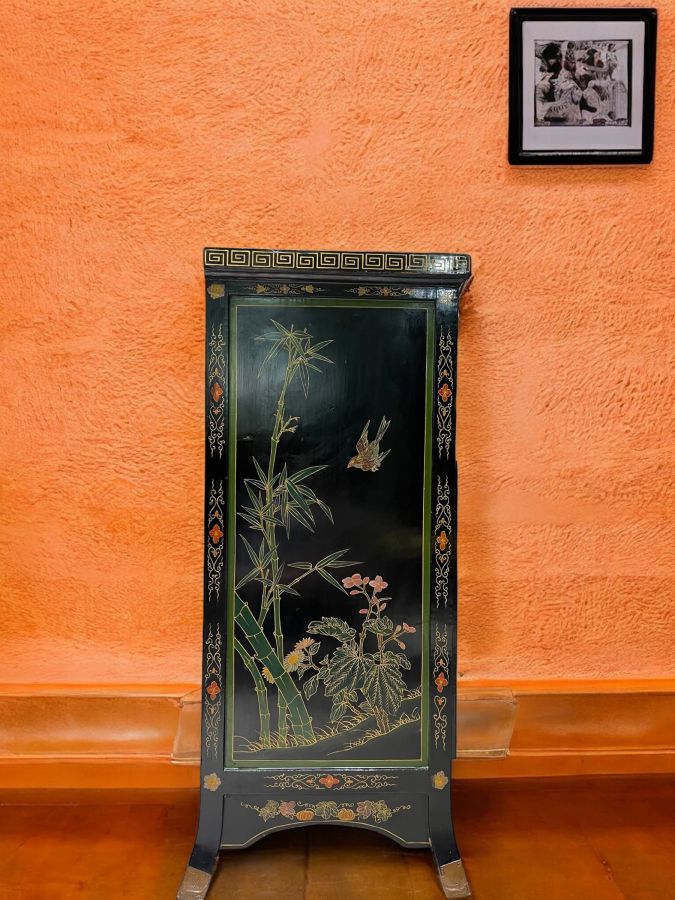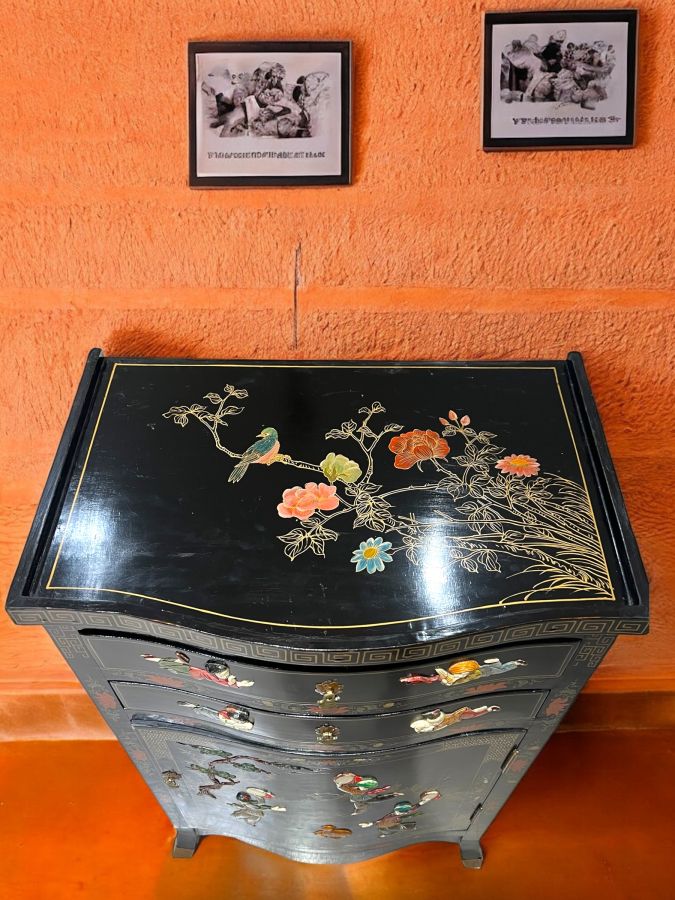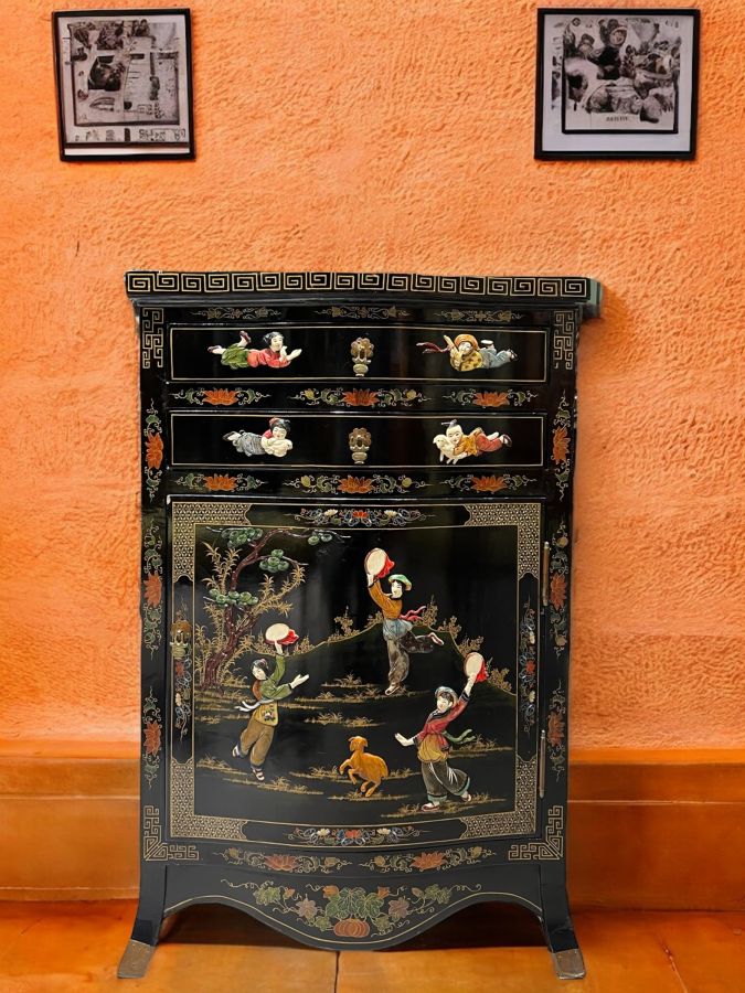 Chiếc tủ được nghệ nhân xưa vẽ sơn mài từng chi tiết, từng góc cạnh.