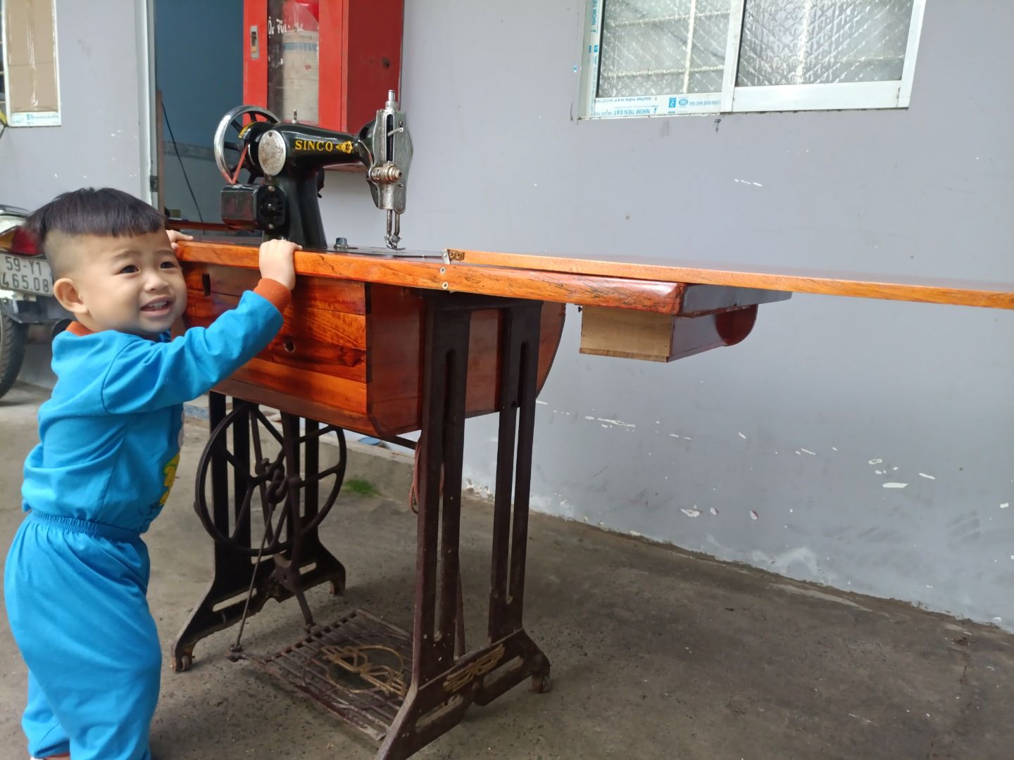 Gồn máy + motor điện cóc đạp + chân sắc + mặt bàn gỗ gõ đỏ nguyên tấm dầy 3cm vâng đẹp , dùng mãi với thời gian 👍