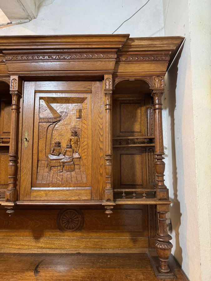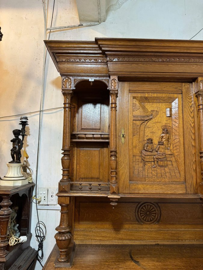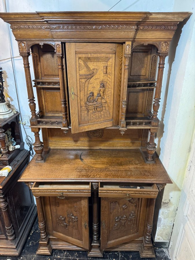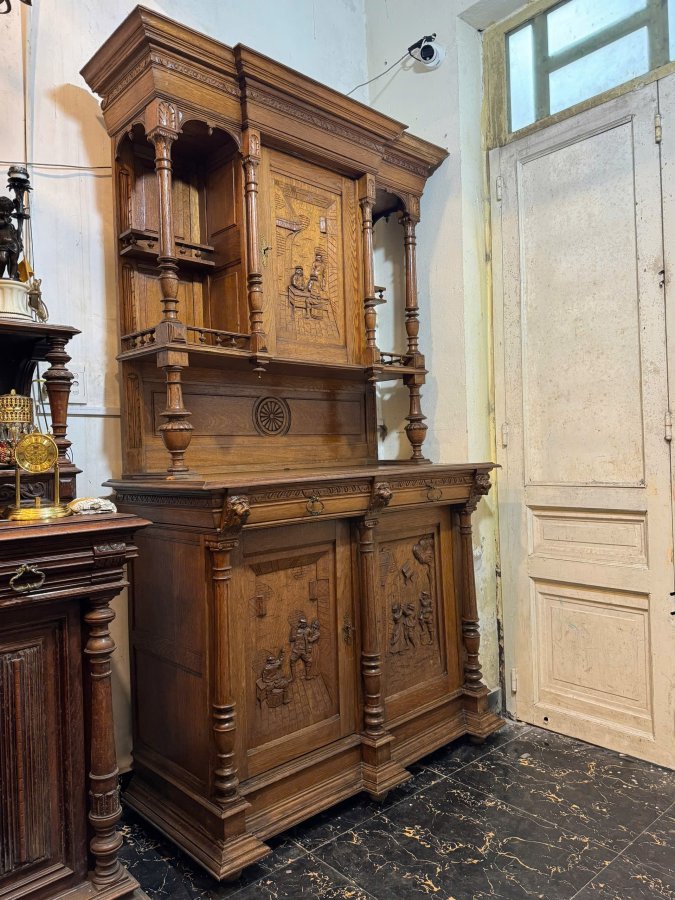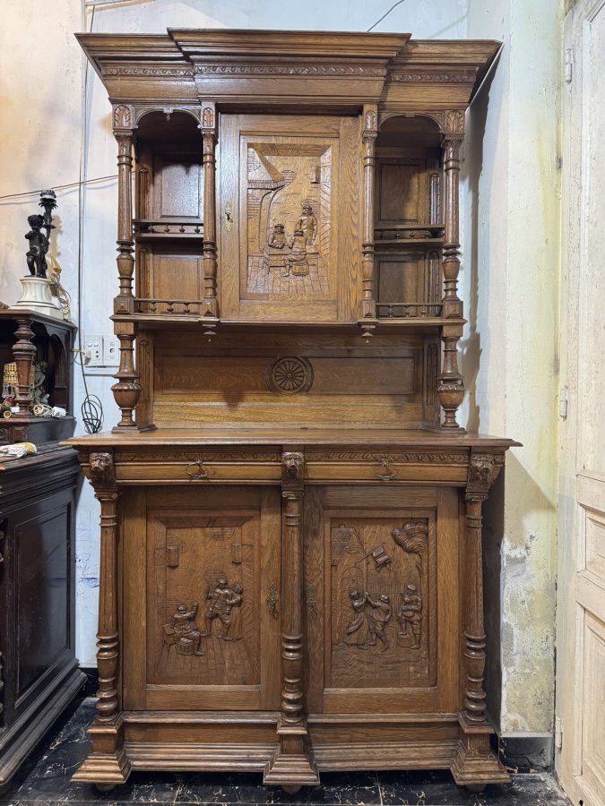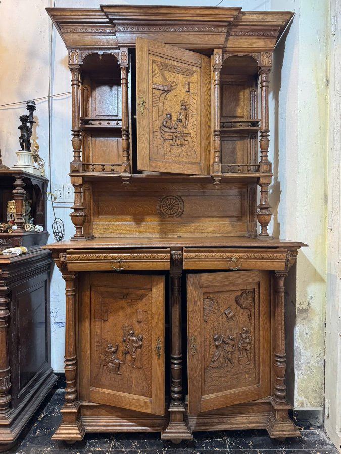 - Tủ được làm từ chất liệu gỗ thịt, được chạm khắc tinh xảo, phức tạp, dày đặc với các chi tiết hình người và các họa tiết trang trí khác
