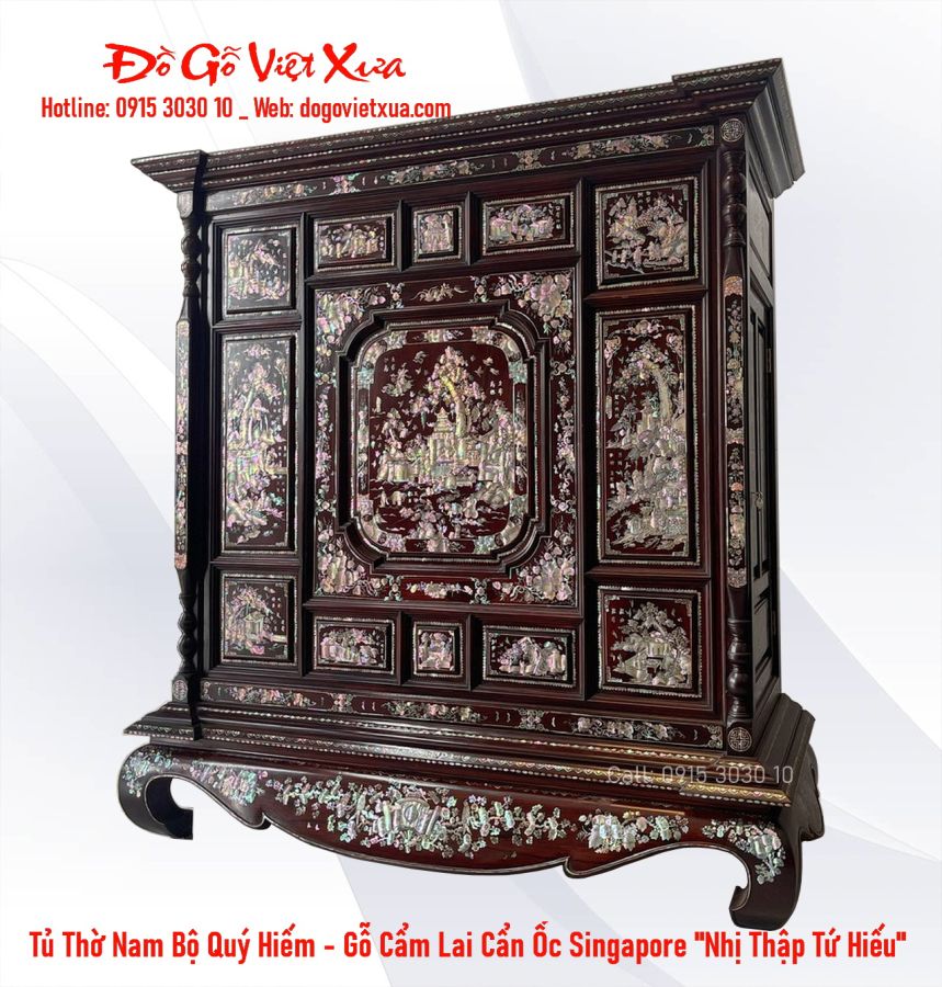 Hôm nay Đồ Gỗ VIỆT XƯA xin được giới thiệu đến quý cô bác anh chị gần xa một cây Tủ Thờ gỗ Cẩm Lai để đời, cẩn ( khảm ) ốc xà cừ đẹp đặc sắc, thuộc loại hàng hiếm có khó tìm. Những tích cẩn trên tủ, nói về 24 tấm gương hiếu thảo của con cái đối với cha mẹ ( Nhị Thập Tứ Hiếu ), ngoài ý nghĩa răn dạy, nó còn mang một ý nghĩa nhân văn, ý nghĩa giáo dục vô cùng to lớn vượt lên cả những giá trị vật chất. Chiếc tủ thờ luôn nhắc nhở thế hệ sau phải luôn nhớ về công lao, biết ơn những thế hệ đi trước.