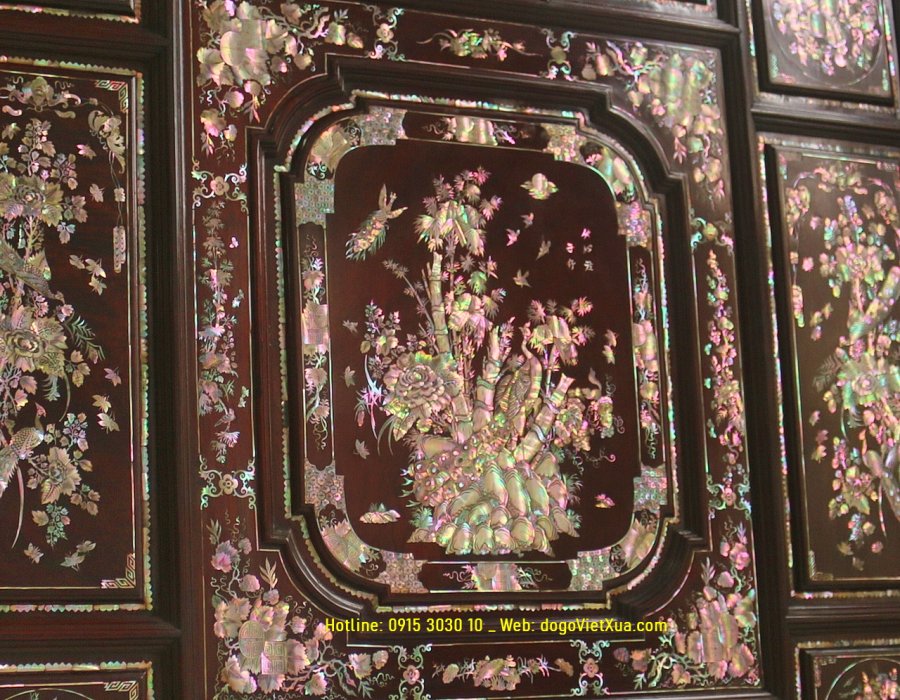 Hình ảnh tinh tế: Họa tiết làng quê, thiên nhiên, hoa văn truyền thống ( Cuốn thư, liễn đối, tứ linh Long - Lân - Quy - Phụng (Phượng), Mai Thọ, Liên Hoa,...) được khảm tỉ mỉ, làm nổi bật giá trị mỹ thuật và ý nghĩa tâm linh.