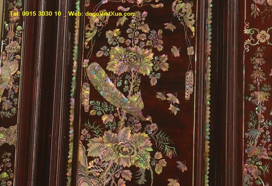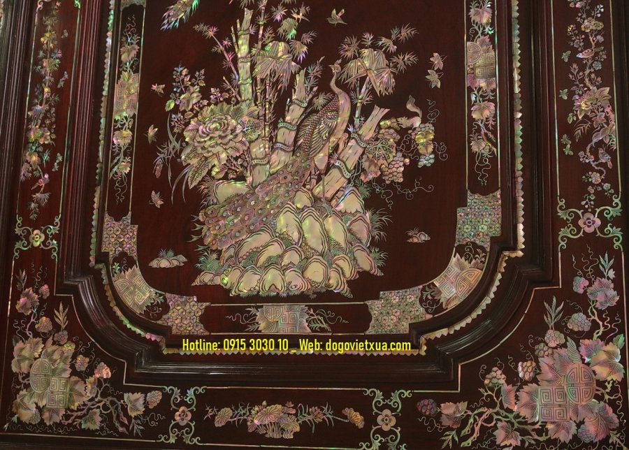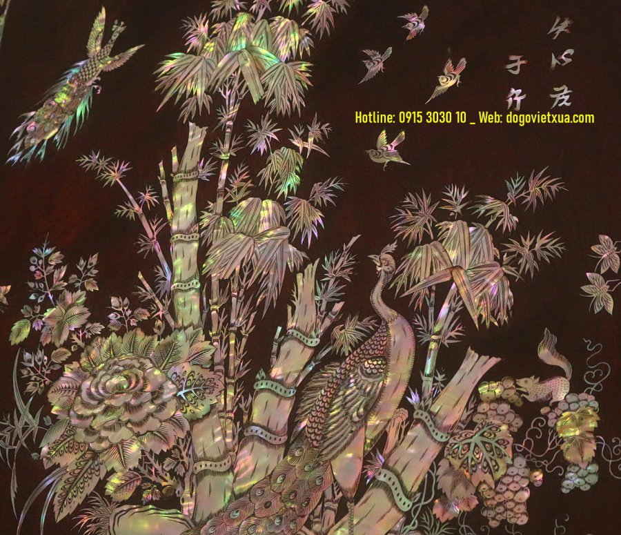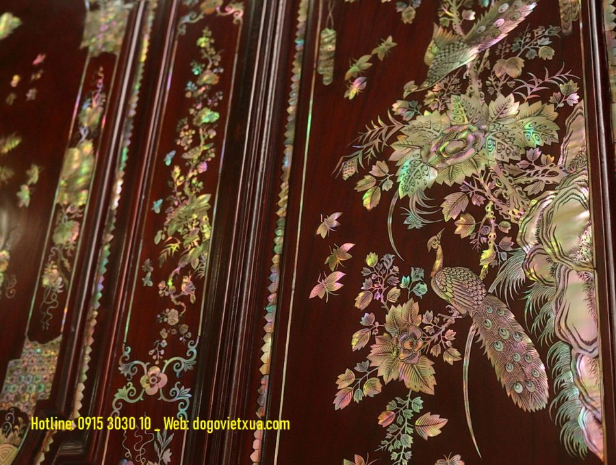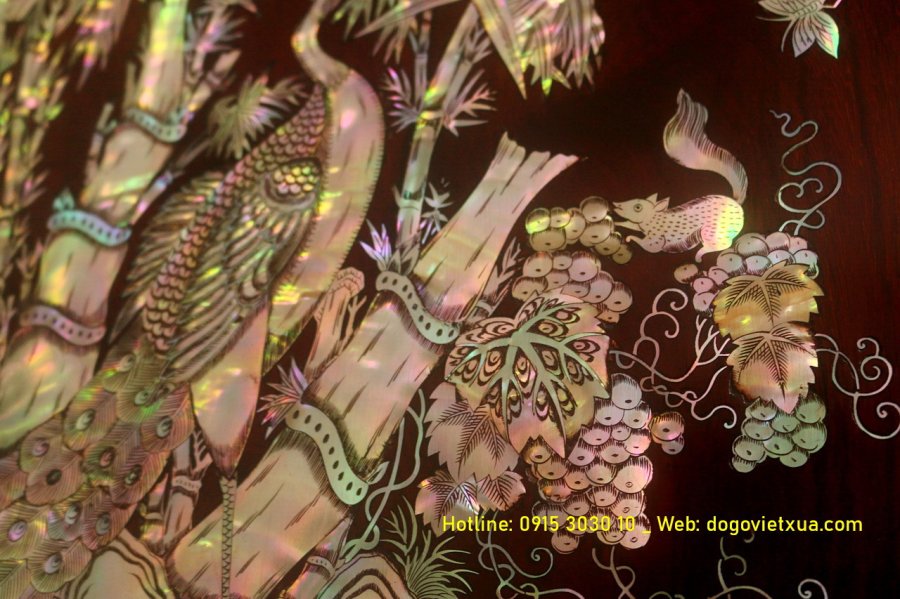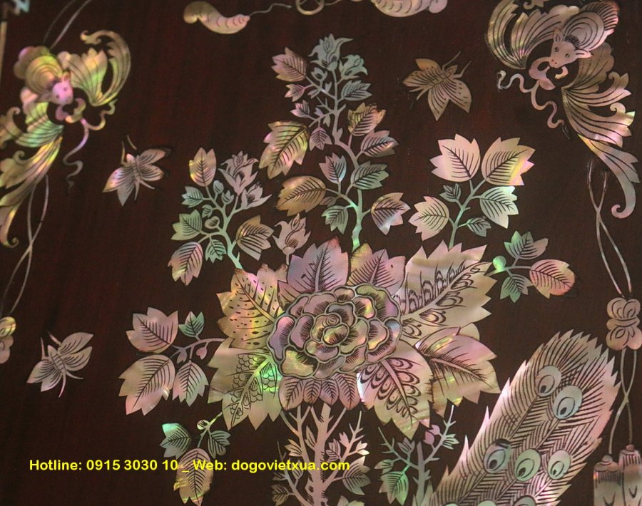 Nghệ thuật cẩn *************: Những miếng ốc được lựa chọn kỹ lưỡng từ vỏ trai ốc biển Singapore quý hiếm, ánh sắc bảy màu tự nhiên rực rỡ, kỹ thuật khảm thủ công tinh xảo tạo nên bức tranh sống động và có chiều sâu.