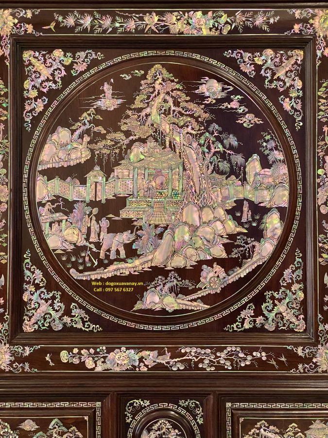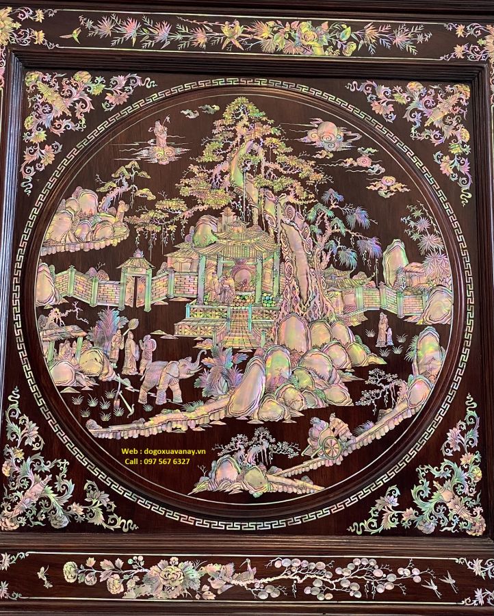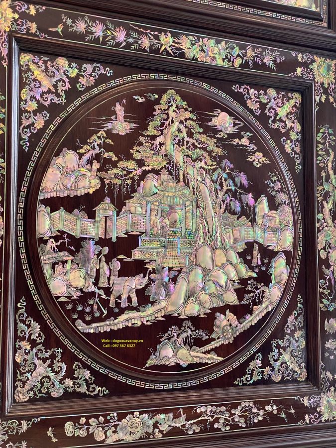 - Phần xung quanh cảnh chính được các nghệ nhân cẩn Chim Hoa - Tứ Quý :