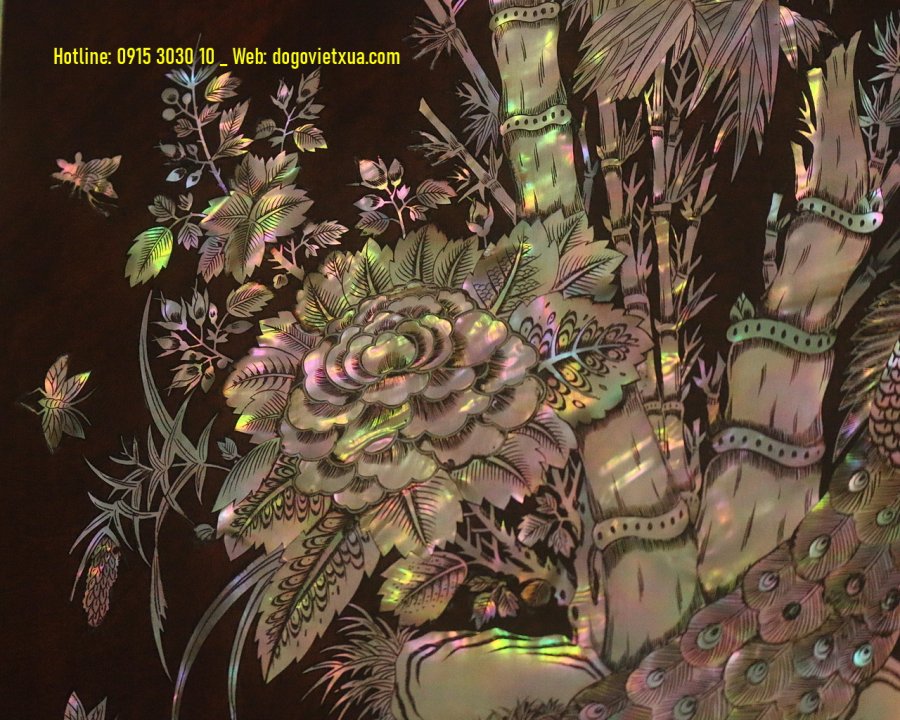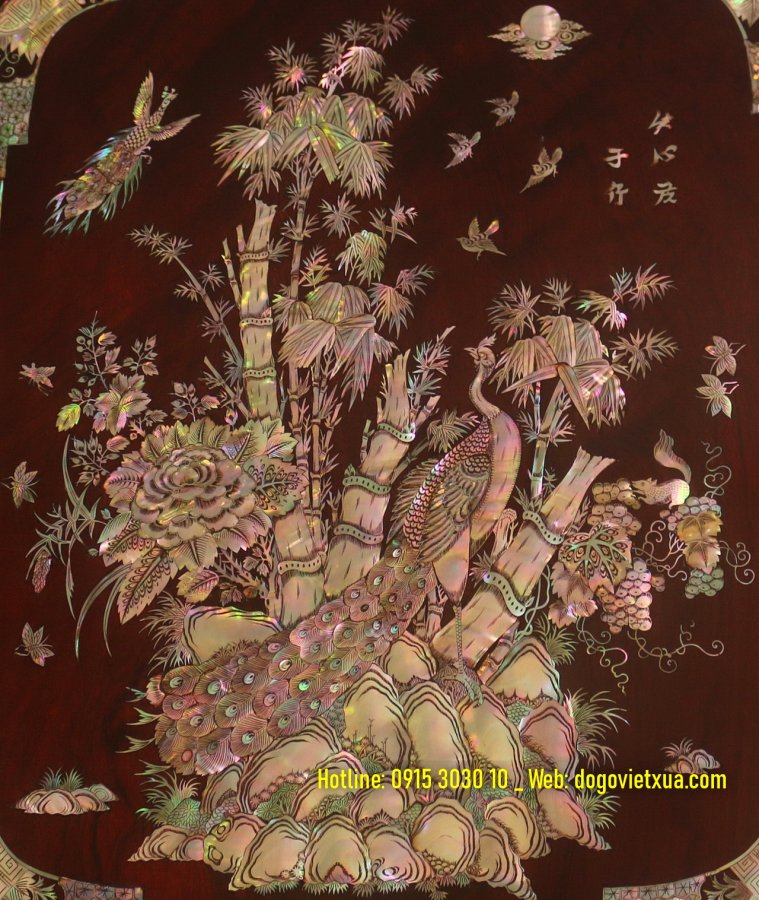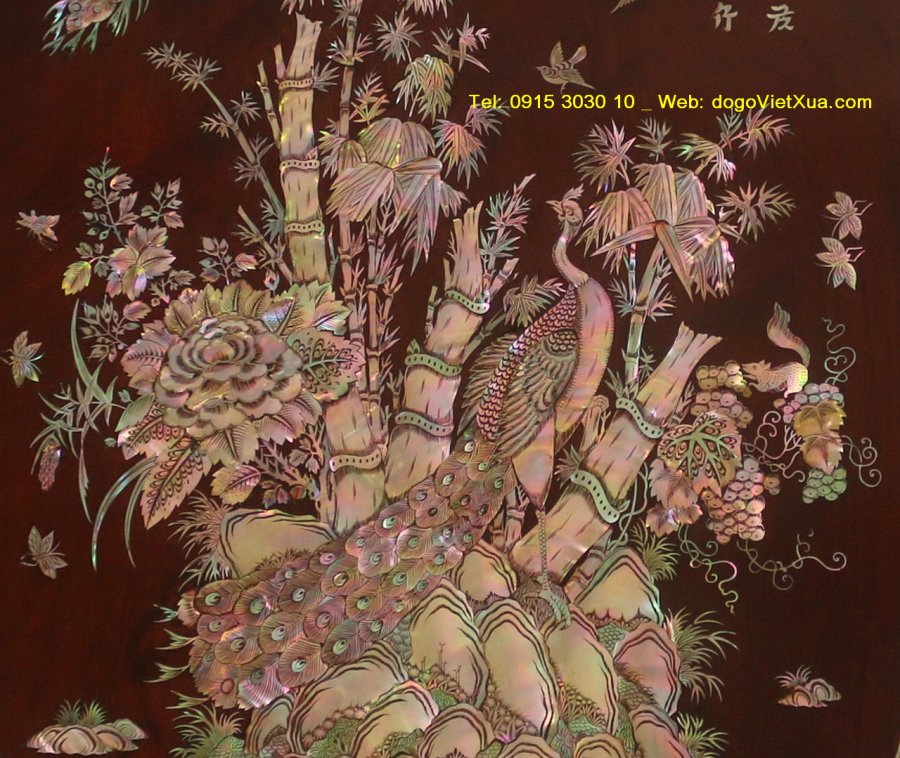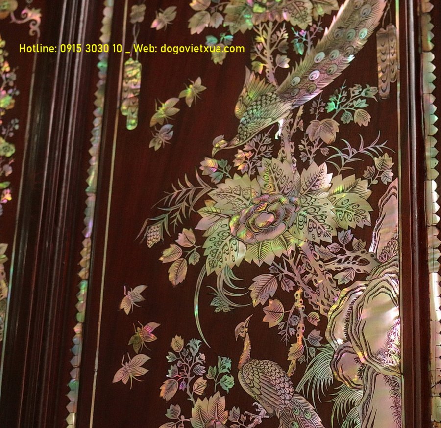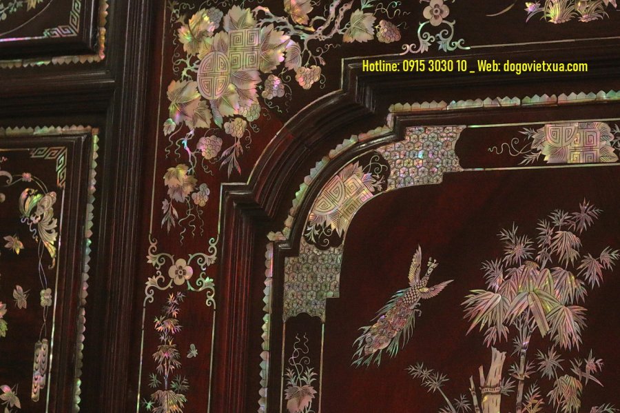 Tủ được nghệ nhân Huế xưa cẩn ( khảm) ốc 3 mặt đỏ lửa, vàng chanh, xanh hoa lý trên nền cây gỗ Cẩm Lai ta , từ khâu nguyên liệu được nghệ nhân lựa chọn rất kỹ càng ( gỗ lọc lõi, dày dặn, ốc xa cu già trong sâu nước ), đến khâu tạo tác, tỉ mỉ công phu, sử dụng nhiều kỹ thuật khó nhất trong nghệ thuật khảm ốc ( sen lọng, phân màu ) . Đường nét hoạ tiết hoa văn cắt tỉa cảnh vật ( Hoa hồng , khóm trúc, Mai Thọ, Tứ quý Tùng – Cúc – Trúc – Mai, Dây Nho,…Đến con giống ( Đôi Chim Công, Tùng Lộc, Bướm, rồi những Chú Sóc,… ) Tất cả đều rất sắc nét tơ tóc, sinh động, thần thái sống động như thật, xưa nay hiếm có cây tủ cẩn cảnh nào đẹp được như cây tủ này.