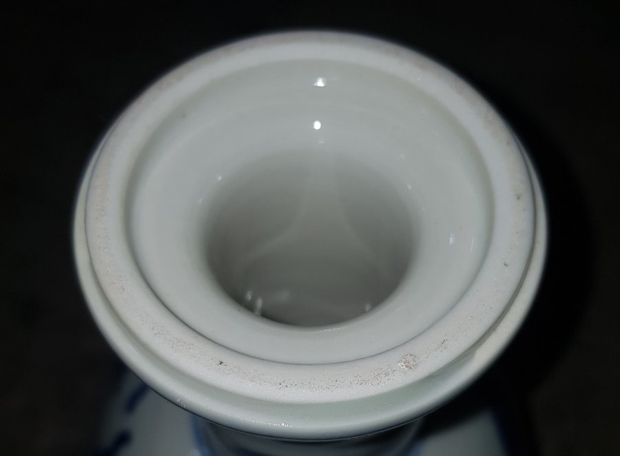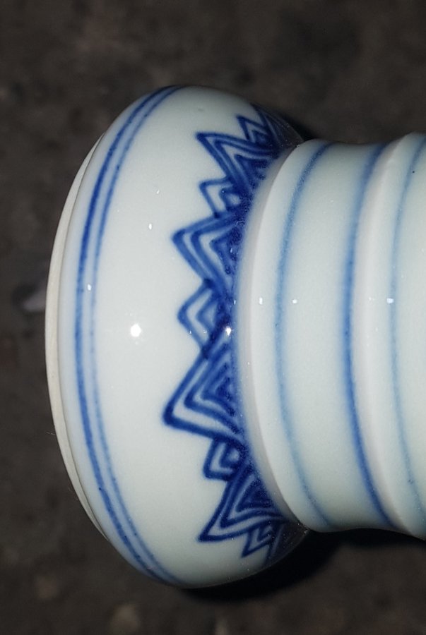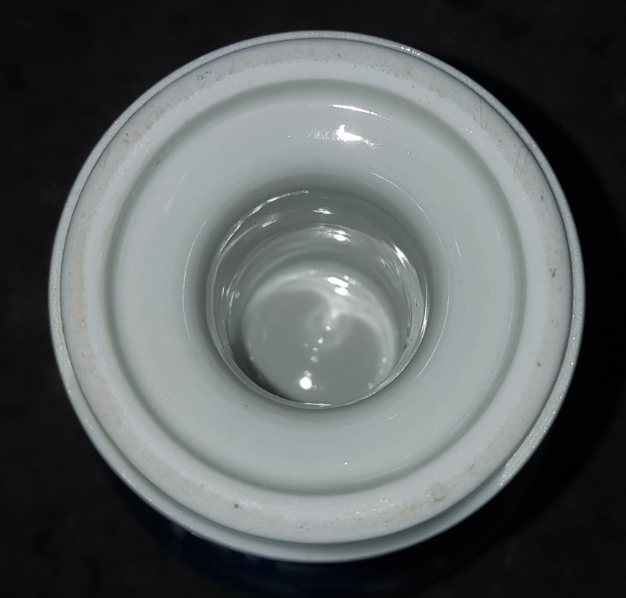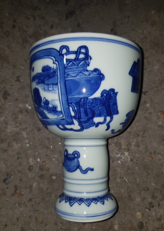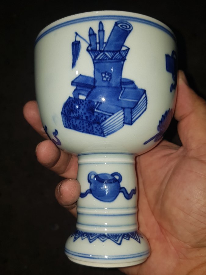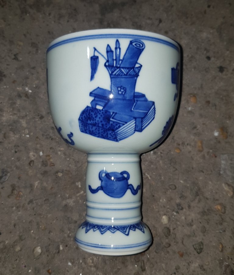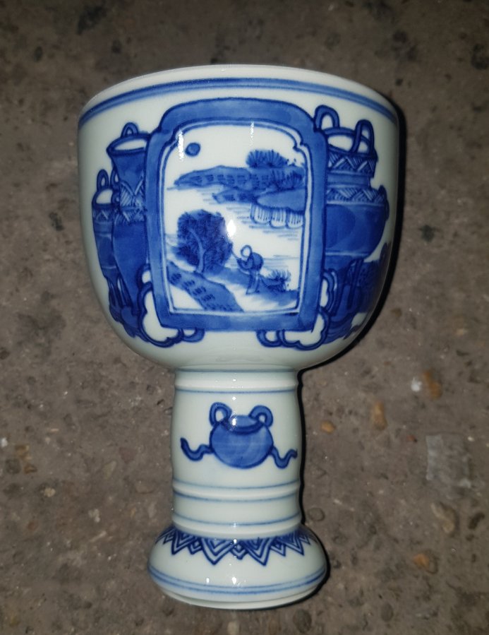 Tước sứ bát bửu cổ đồ men lam chàm hồi cao lanh tinh tuyển với tầng hoa văn hoa sen điểm nhấn dưới chân tước. Tước cao 14.5cm. miệng 9.5cm. GL1250k