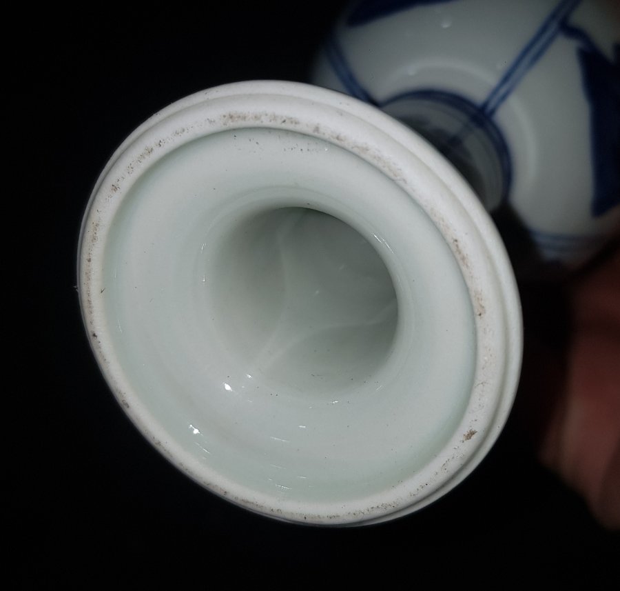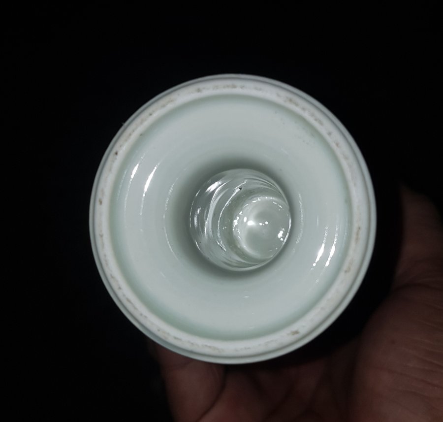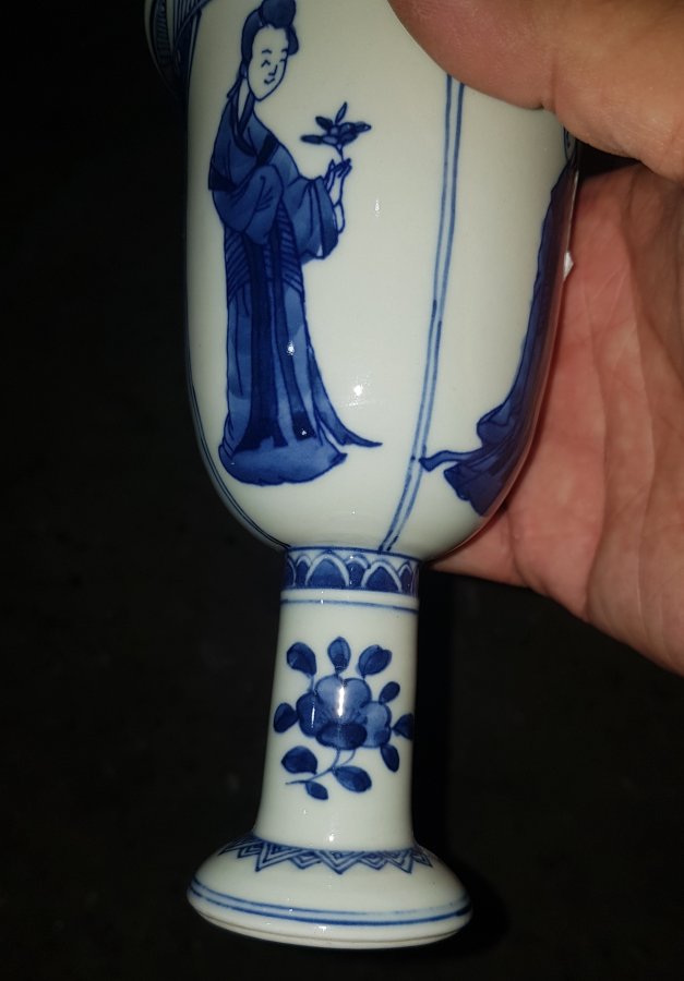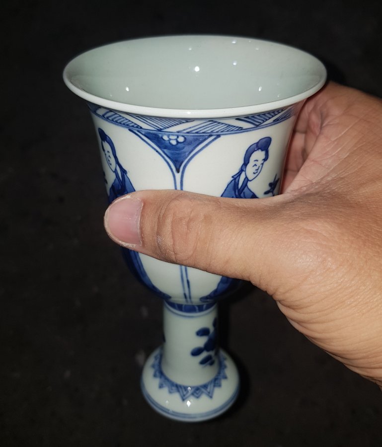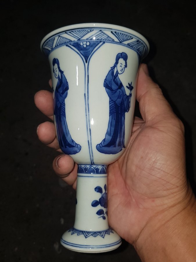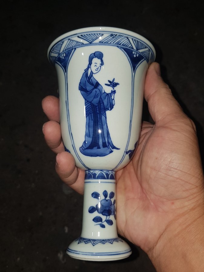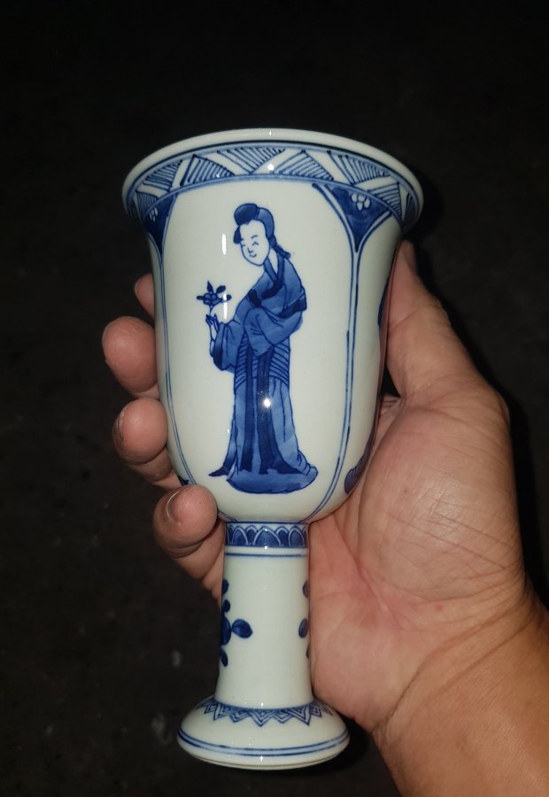 Tước sứ chân cao vẽ tứ đại mỹ nhân men lam chàm hồi cao lanh tinh anh có tổng chiều cao 16cm. miệng 9.5cm. lành lặn. GL1250k