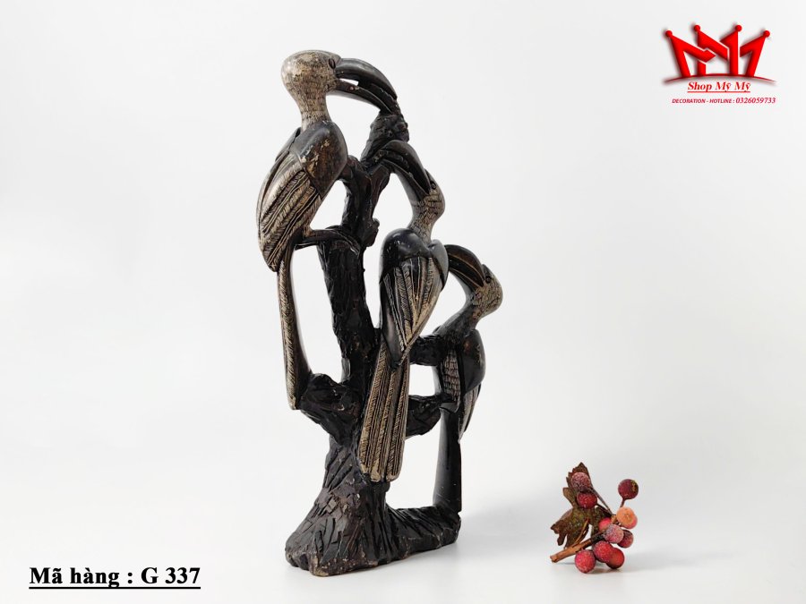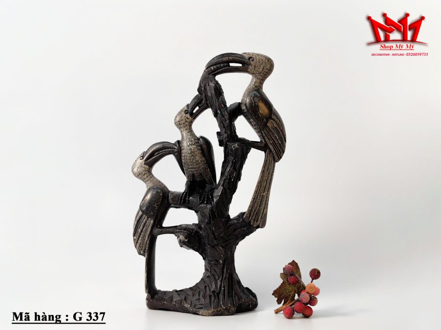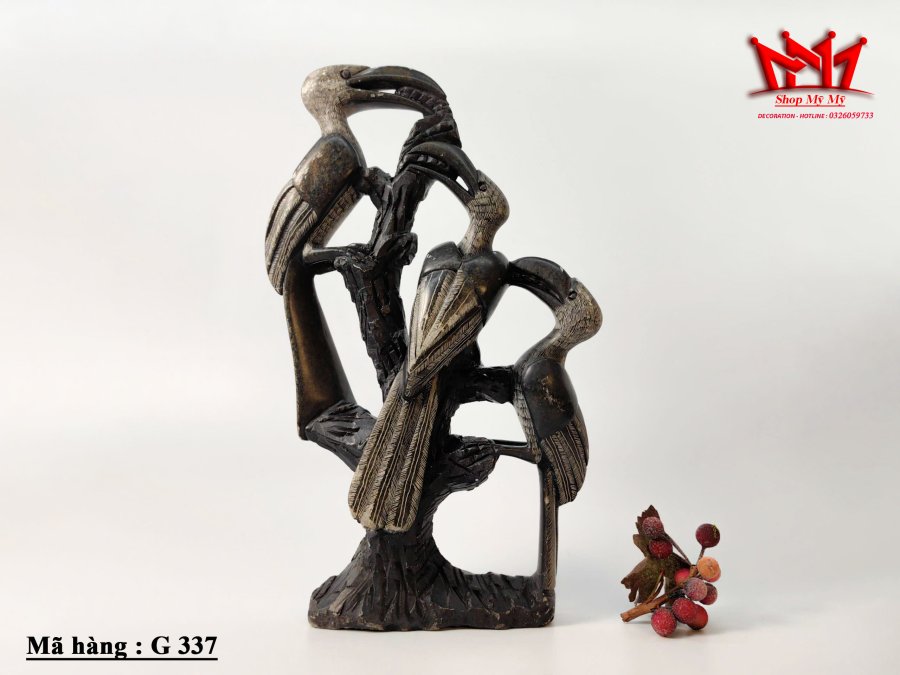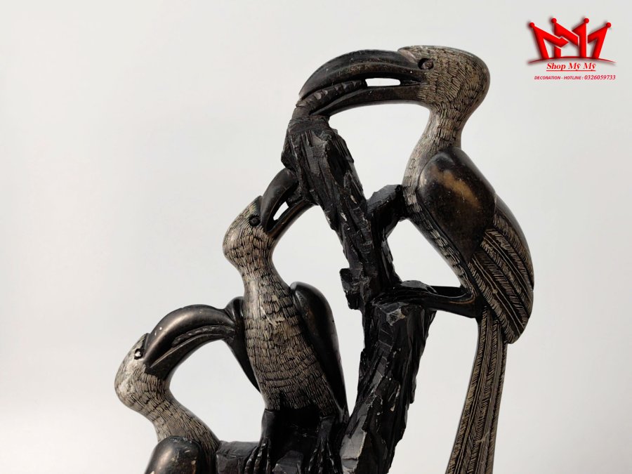Tượng 3 con chim mỏ sừng trên thân cây.