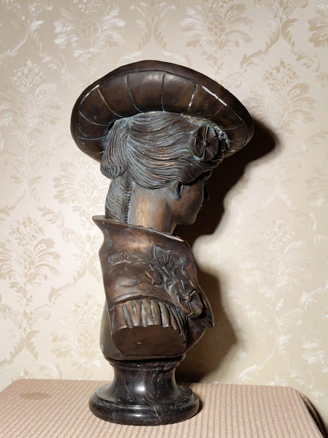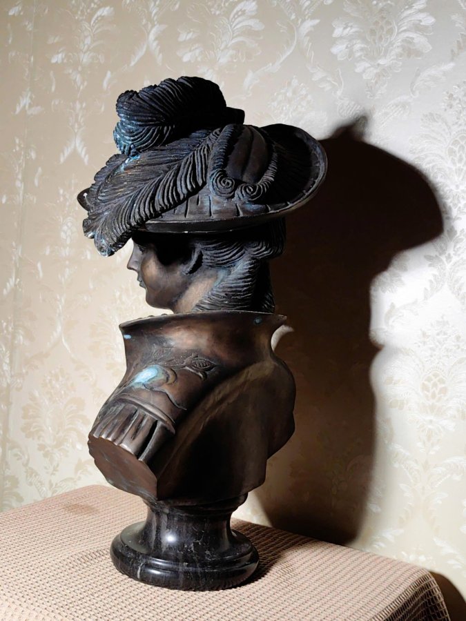Tượng bán thân bằng đồng mô tả một phụ nữ trong trang phục và mũ phong cách Victoria hoặc Art Nouveau, thường được gọi là "Femme Au Chapeau" (Người phụ nữ đội mũ). Tác phẩm này được biết đến nhiều nhất là của nghệ sĩ người Pháp Jean-Louis Grégoire (1840-1890) hoặc Friedrich Salomon Beer (1846-1912).