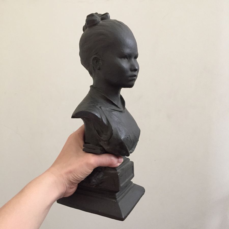 Giao lưu tượng đất nung giả đồng thời Đông Dương, chân dung cô g.ái Nam Kỳ (Cochinchine congaïe) trước những năm 1910. Có chữ ký tác giả L.Ruffier (nhà điêu khắc cho Dinh Xã Tây, nay là Ủy Ban Nhân Dân TP HCM), cao 33cm, tình trạng như hình, có vết nứt bể theo thời gian. GIÁ 2.800 Eur